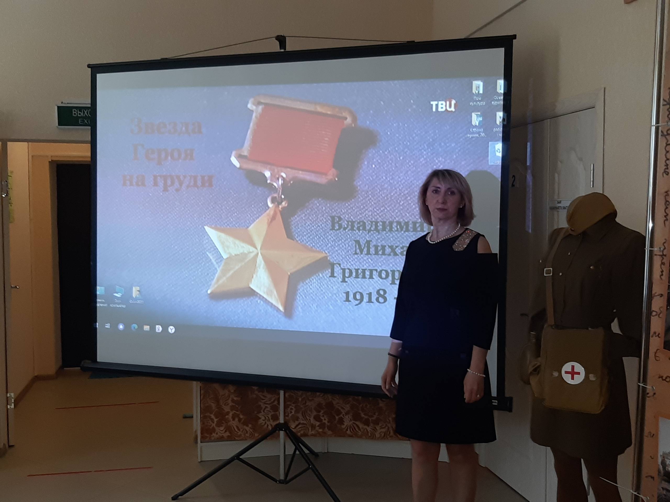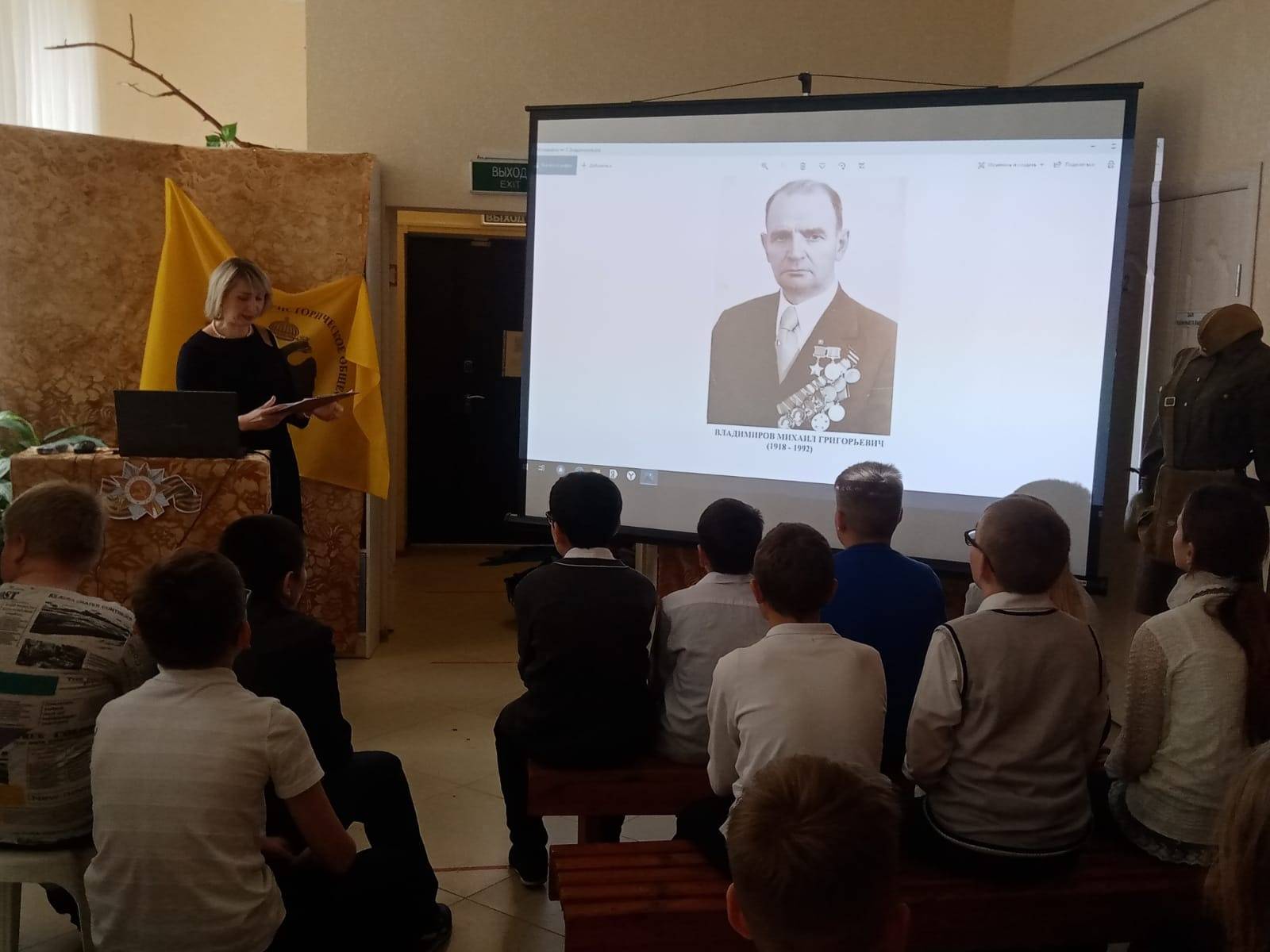 Научный сотрудник музея, член РО РВИО СК Герасимова М.Ф. рассказала о таких понятиях, как «герой» и «героический поступок/подвиг» на примере жизни земляка. Она отметила, что М.Г. Владимиров – единственный участник Великой Отечественной войны в Новоалександровском городском округе, награждённый этим высоким званием. За годы войны штурман эскадрильи 108-го авиаполка капитан Владимиров М.Г. совершил 267 боевых вылетов. На его счету немало разбитых складов с боеприпасами, эшелонов, военных объектов и кораблей противника. Звание Героя Советского Союза присвоено Владимирову М.Г. 5 ноября 1944 года за участие в бомбардировке фашистского линкора «Тирпиц».
