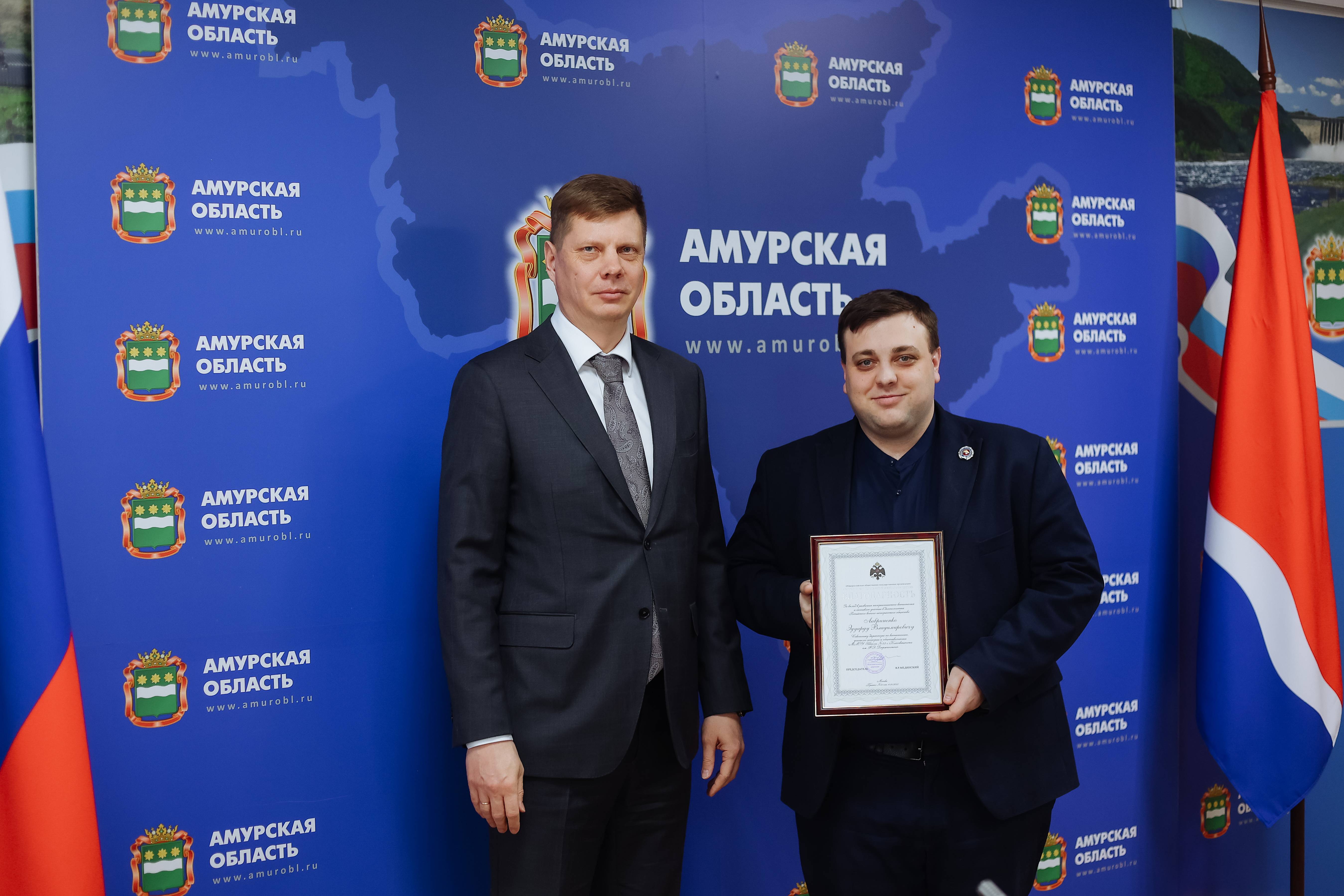 Награду вручил заместитель председателя Правительства области, председатель регионального отделения РВИО в Амурской области Андрей Дюмин.