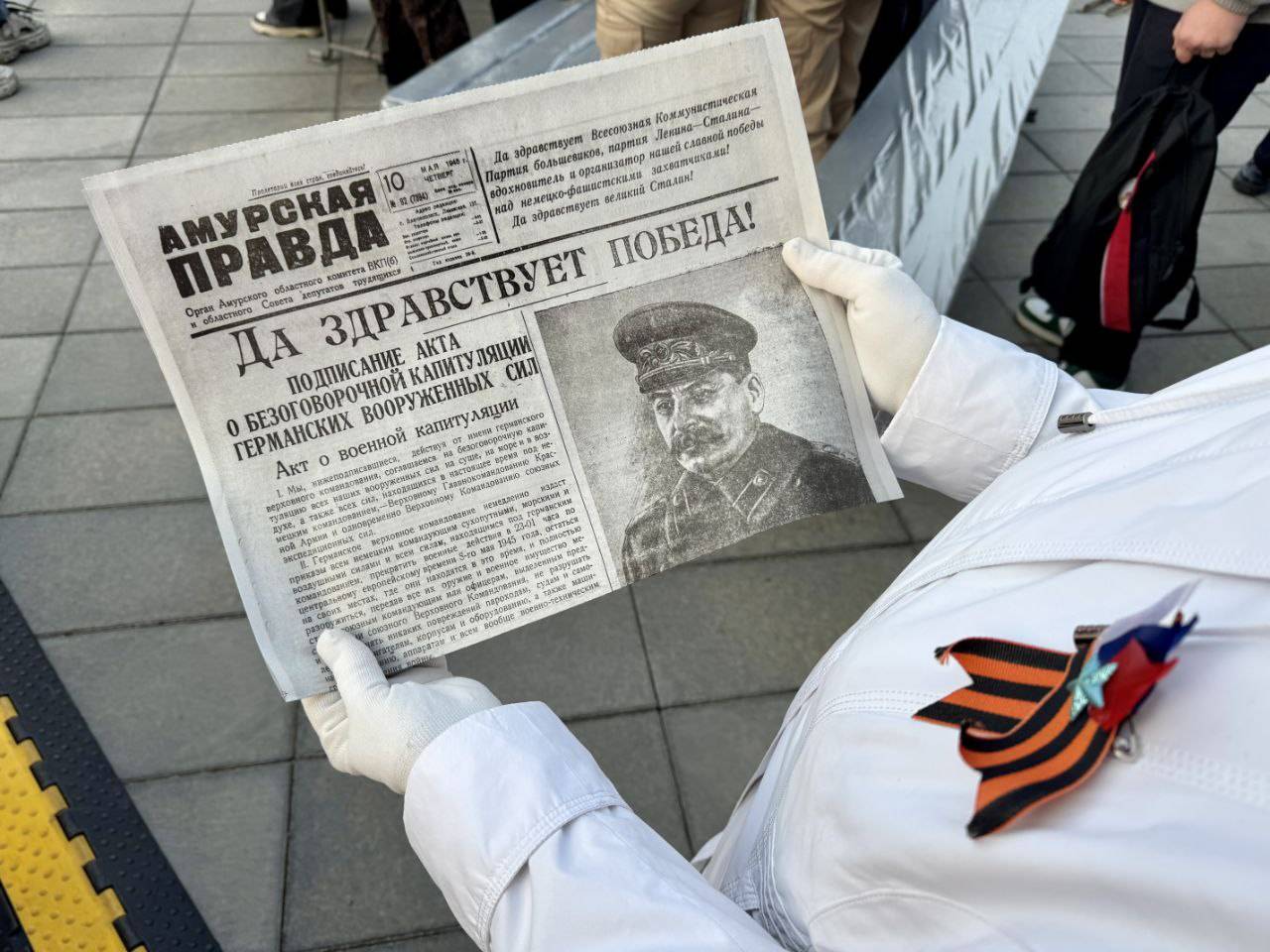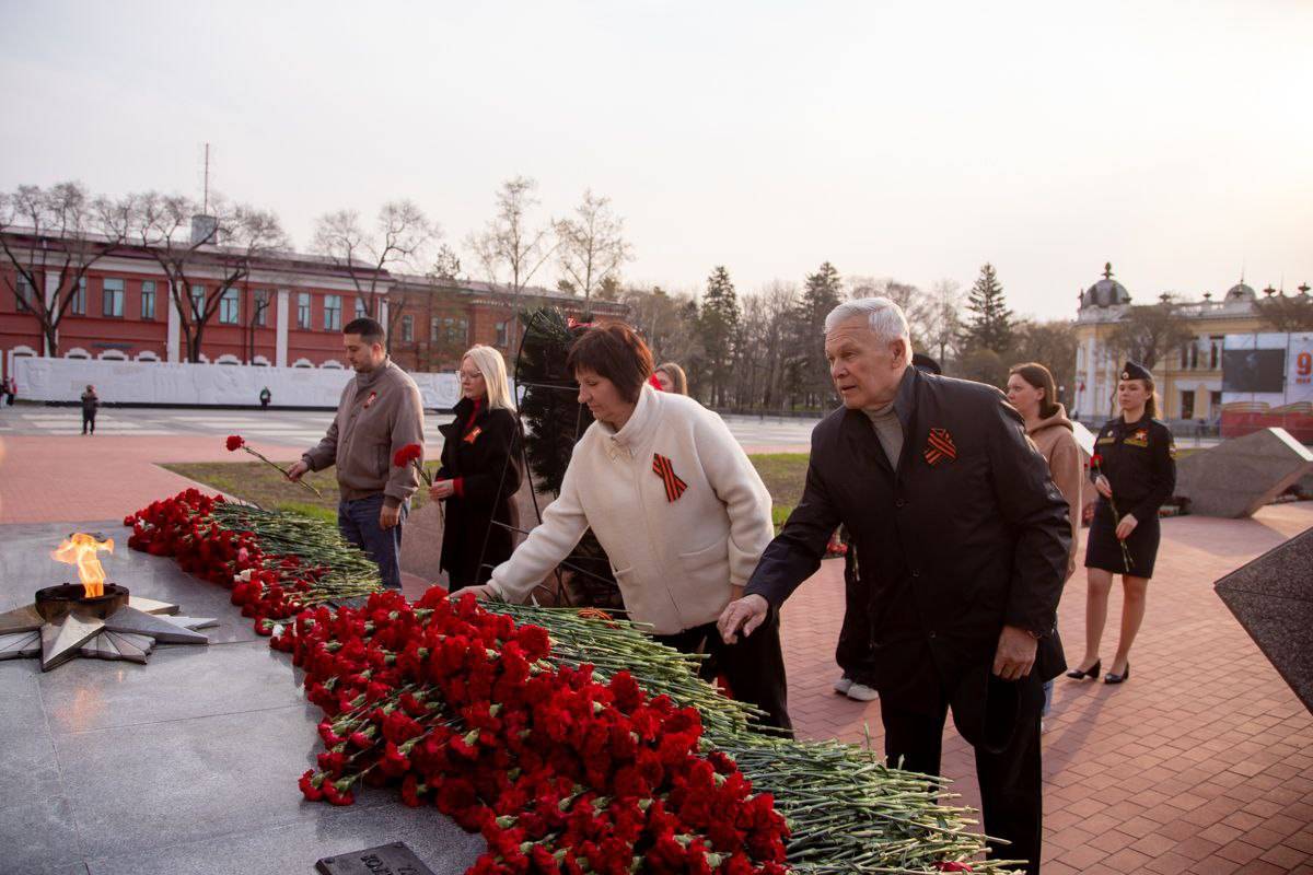 После просмотра видеоролика участники проследовали по набережной к площади Победы, где возложили цветы. Символично, что набережная Амура в мае 1945 года представляла собой линию фронта. На правом берегу располагались войска милитаристской Японии. Победа 3 сентября 1945 года была впереди.