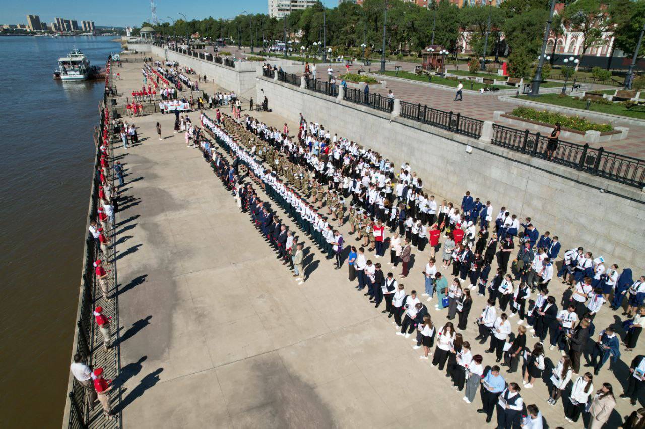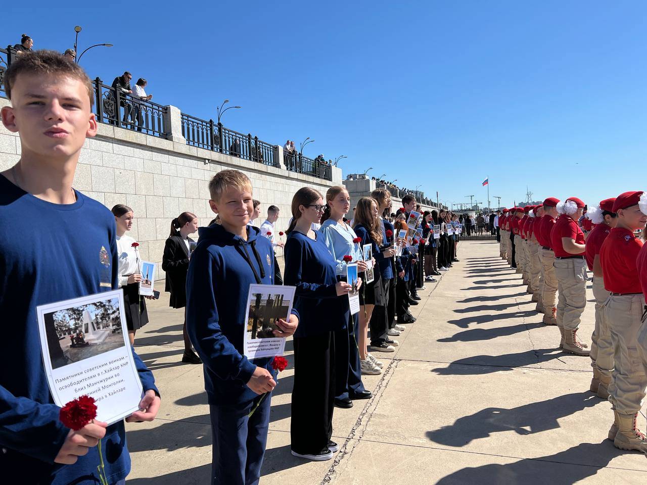 В этом году к акции присоединились больше 500 городских школьников, которые маршем прошли по набережной реки Амур, неся в руках планшеты с изображением памятников, установленных в честь павших советских солдат на территории Российской Федерации, Европейских стран и Китайской Народной Республики.