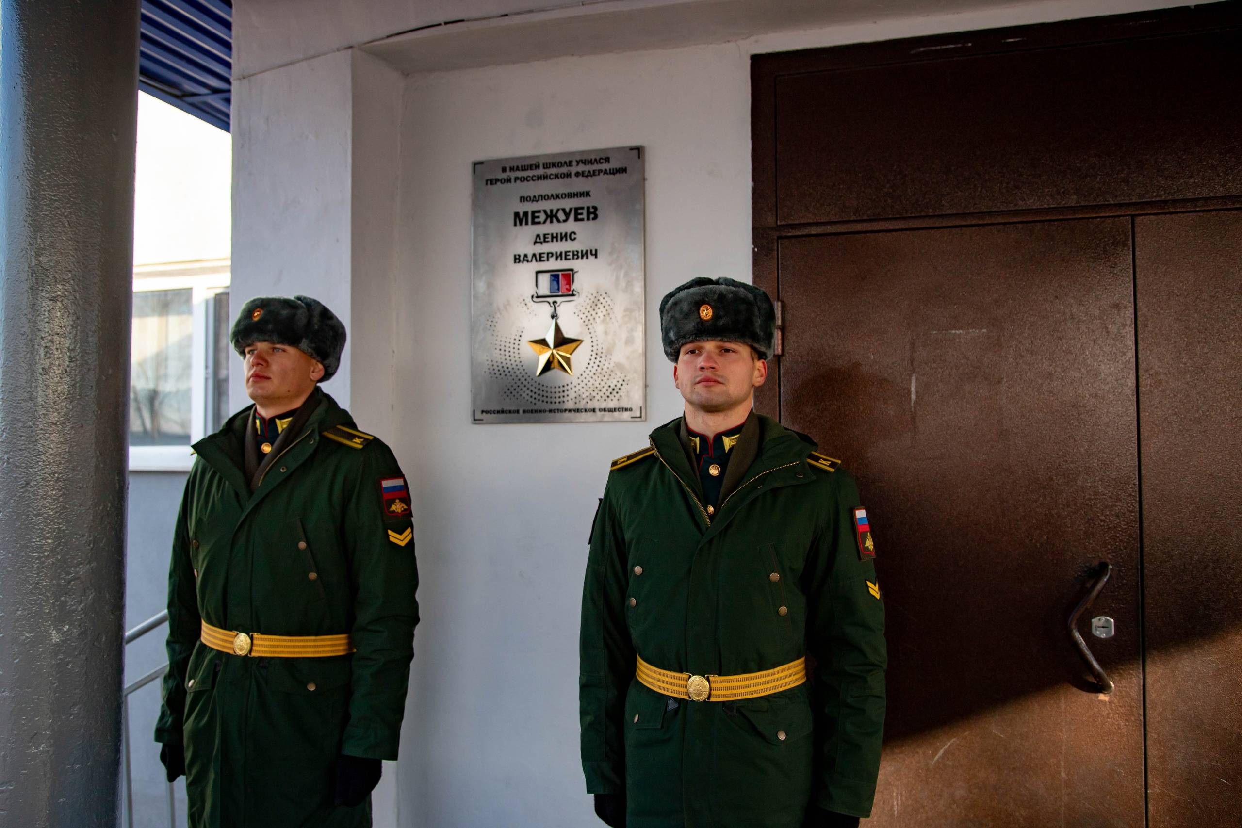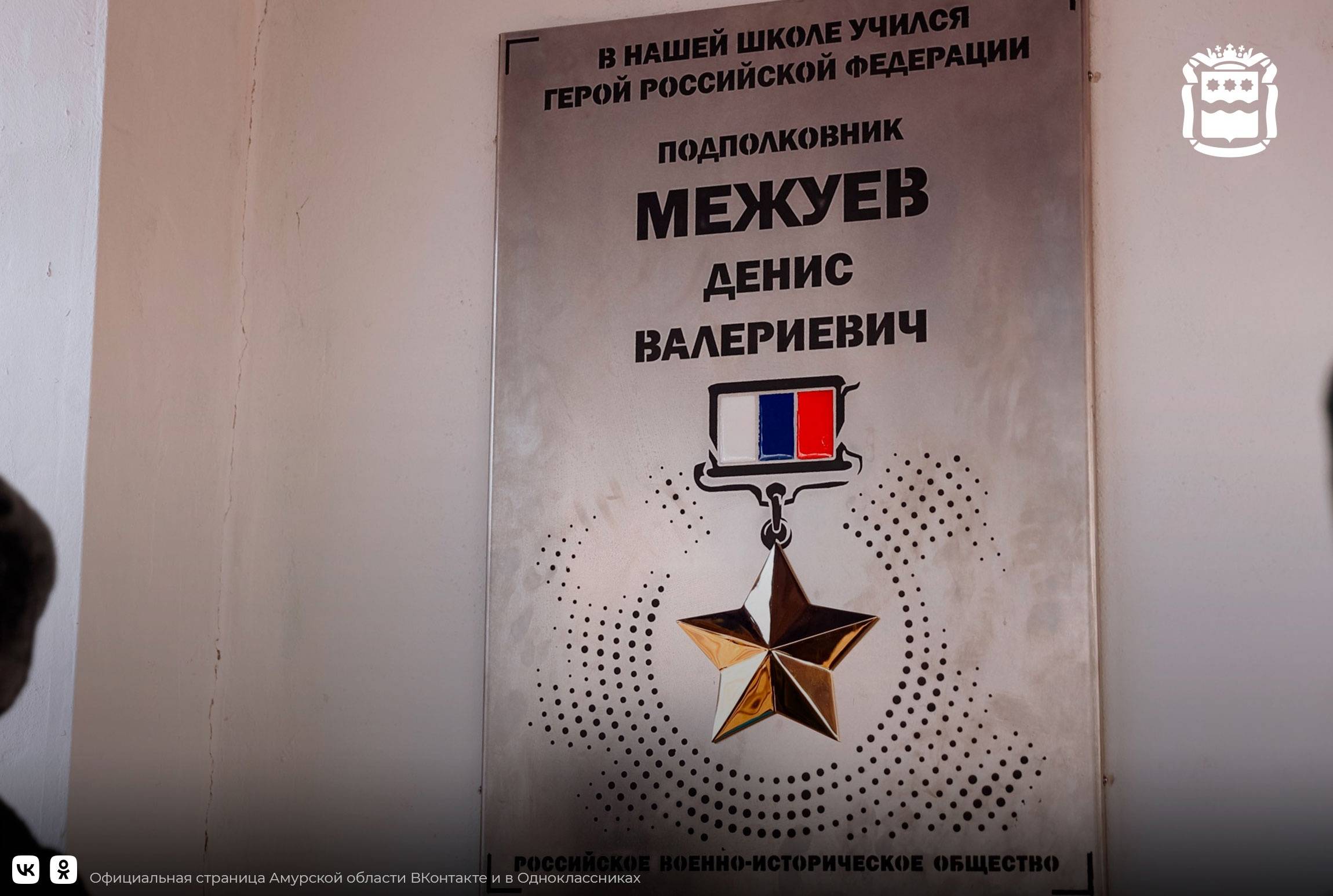 Сегодня при поддержке Российского военно-исторического общества в Благовещенске состоялось открытие памятной доски Герою России Денису Межуеву. Доска установлена на здании школы № 10, которую окончил герой.