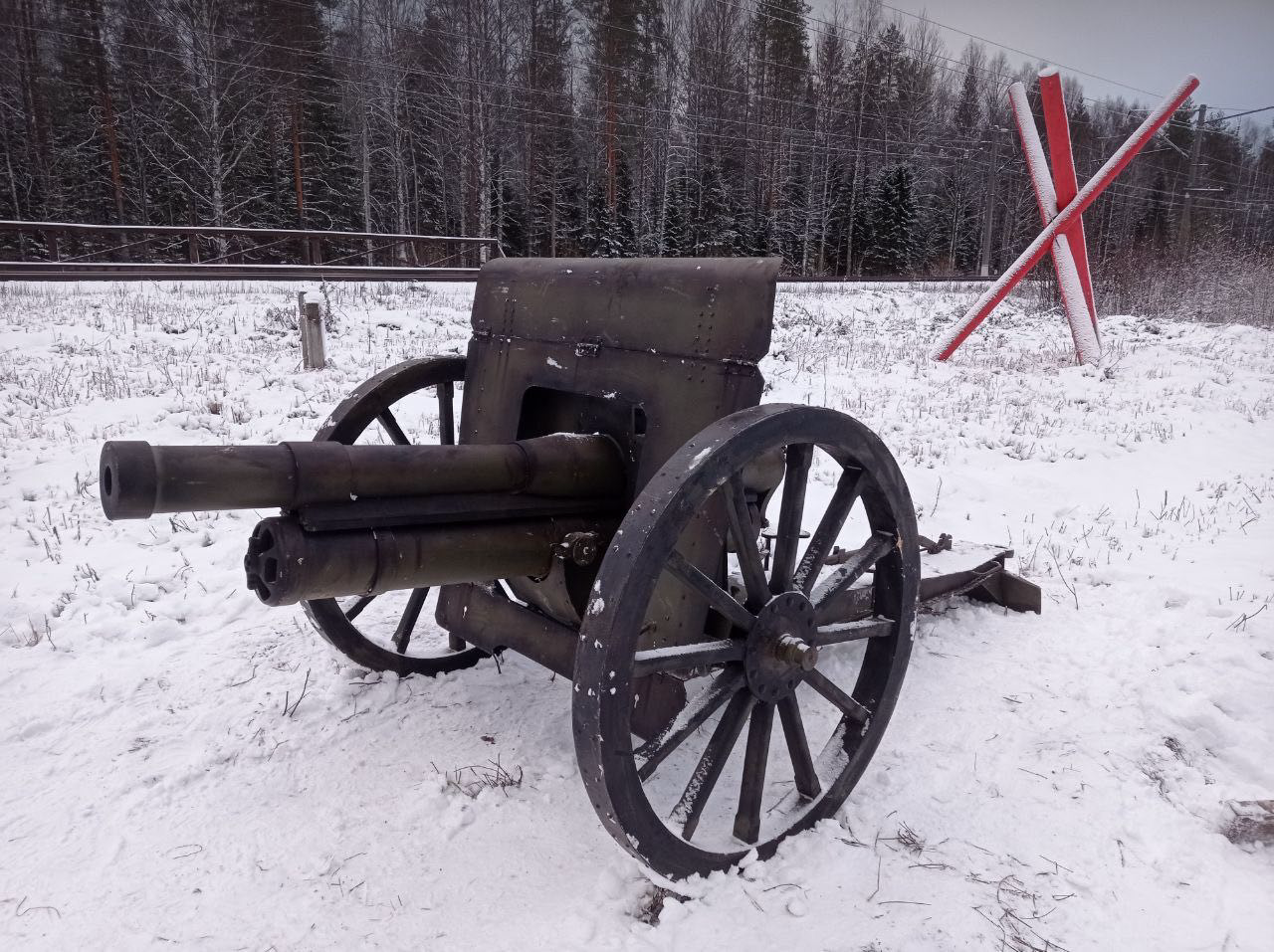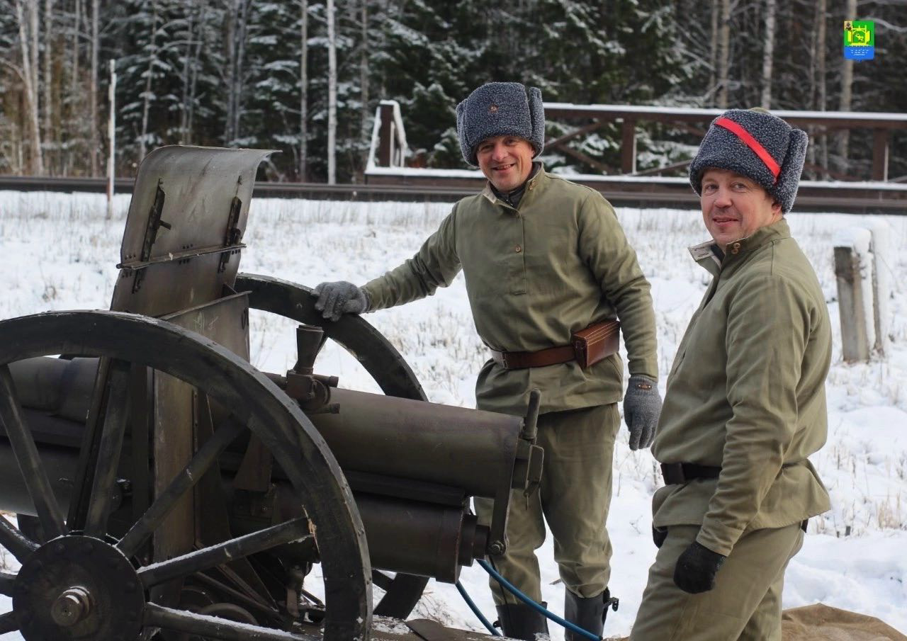 Стрельба велась не просто так, для создания атмосферы. Это была демонстрация орудия, установленного накануне в военно-историческом парке под открытым небом "Юрьевский рубеж". Конечно, пушка не настоящая. Это полевой макет 3-дюймовго орудия времен Первой мировой войны (образца 1902 года). Артиллерийская пушка символизирует один из трёх родов войск – артиллерию, которая наряду с бронетанковыми войсками и боевой авиацией играла главную роль в вооруженном противостоянии красноармейцев и интервентов на Железнодорожном фронте.