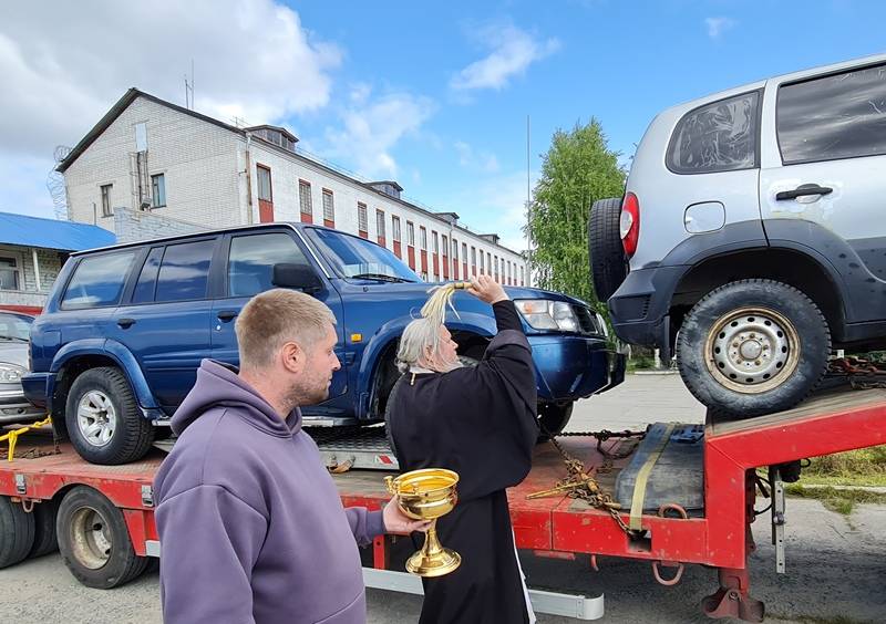 После приветственных речей клирик храма Успения Божией матери в Архангельске иерей Леонид Перчугов, который сам был в зоне боевых действий СВО, провел чин освящения автомобилей.