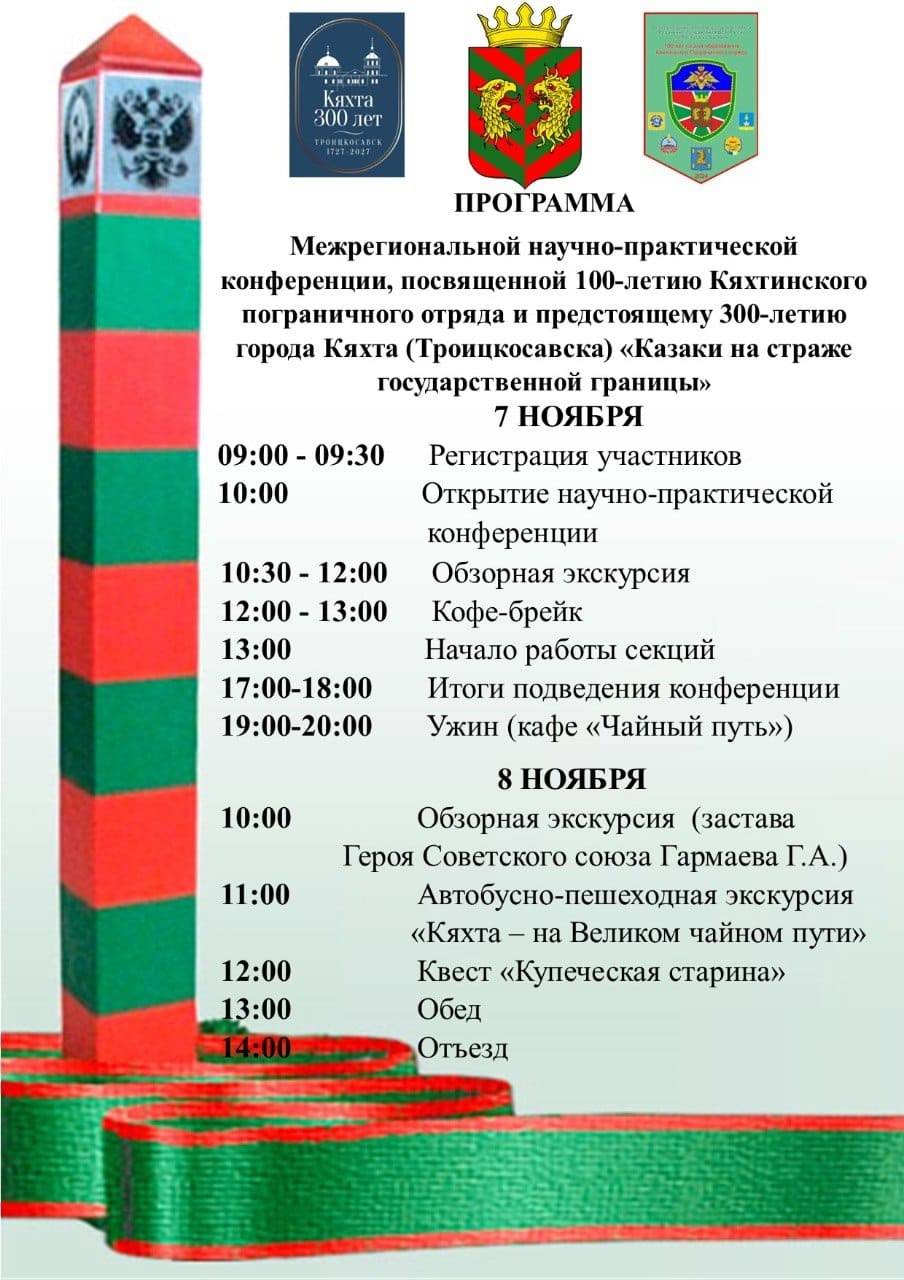 7-8 ноября 2024 г. в г. Кяхта прошла Межрегиональная научно-практическая конференция "Казаки на страже государственной границы". Конференция был посвящена 100-летию Кяхтинского погранотряда и предстоящему 300-летию города Кяхта (Троицкосавска). Участников конференции приветствовал руководитель Регионального отделения РВИО Михаил Харитонов, особо отметив роль Троицкосавска как военного исторического города на границе и необходимость системной работы по изучению и популяризации военной истории края. Работало две секции - взрослая и школьная. Обсуждался широкий спектр вопросов от теоретического осмысления продвижения России на Восток, до семейных историй. С докладами выступили гости из Улан-Удэ, Иркутска, Санкт-Петербурга, Благовещенска. Одним из решений конференции было пожелание продолжить работу по проведению исследовательской работы и ежегодных научных конференций по этой тематике.