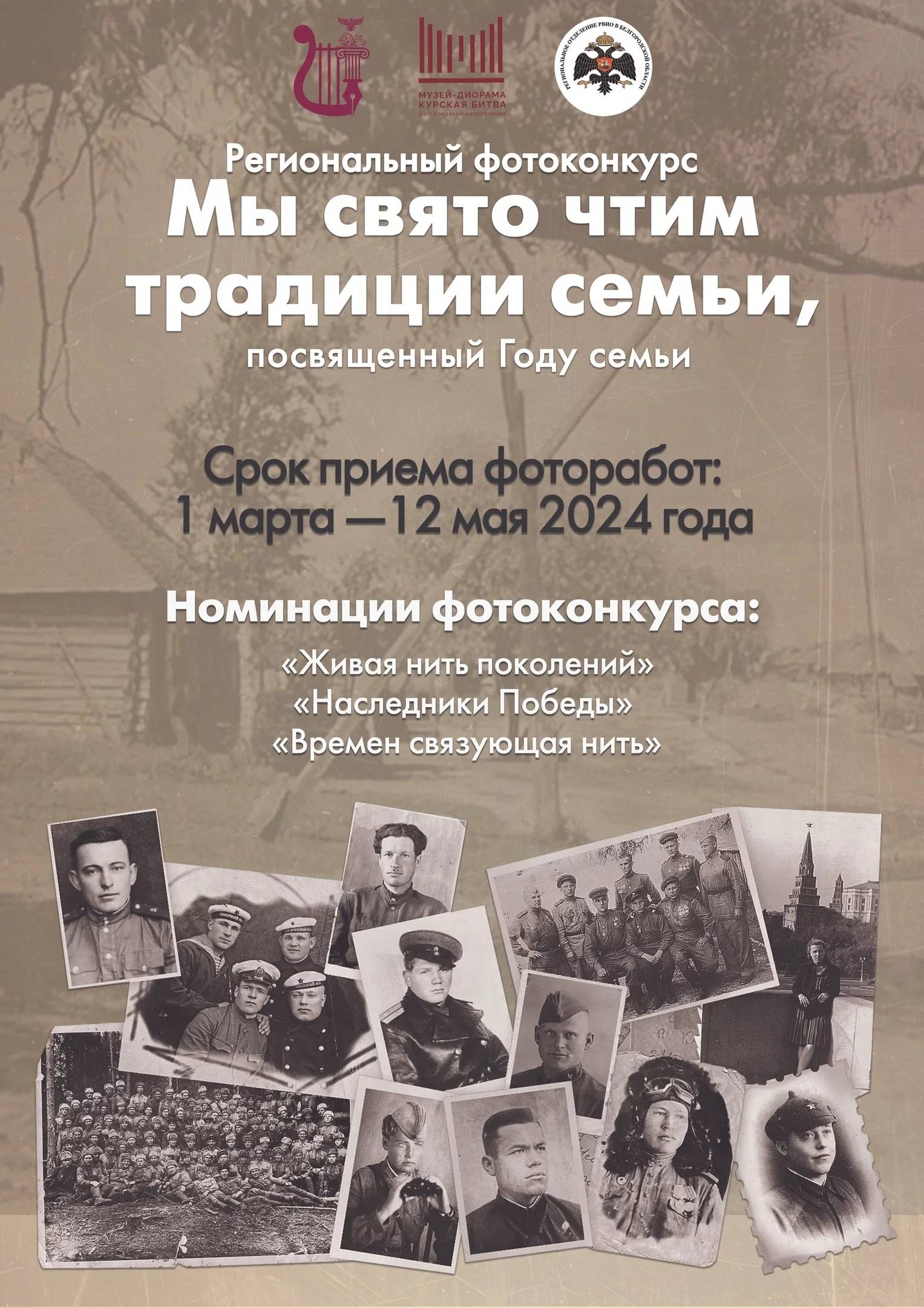 Региональное отделение Российского военно-исторического общества в Белгородской области совместно с Белгородским государственным историко-художественным музеем-диорамой «Курская битва. Белгородское направление» проводят региональный фотоконкурс «Мы свято чтим традиции семьи», посвященный Году семьи.