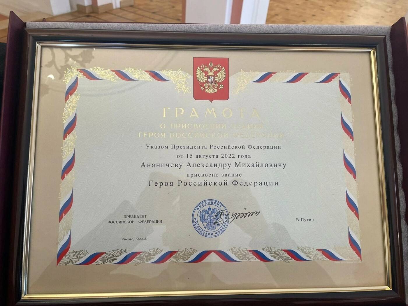 Награду Героя вручили его семье в Москве. Церемония прошла в Центральном доме Российской армии. Он стал первым белгородцем, которому присвоили звание Героя России за участие в спецоперации. Александр Ананичев десятый в ряду Героев России – уроженцев Белгородской области. Ранее звание Героя России были удостоены: ветеран внешней разведки полковник Владимир Барковский, капитан Андрей Богатов, полковник полиции Владимир Бурцев, гвардии младший сержант Юрий Ворновской (посмертно), старший сержант милиции Вячеслав Воробьёв, гвардии старший сержант Денис Зуев (посмертно), подполковник Антон Копейкин (посмертно), полковник Виктор Трофименко, гвардии сержант Юрию Чумак (посмертно).