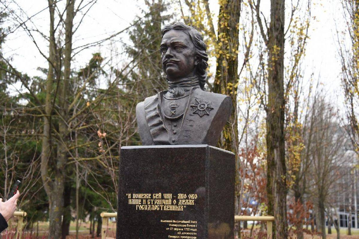 В Белгороде открыли памятник Петру Первому. Бронзовый бюст установлен в парке Южный. Автор – известный белгородский скульптор, заслуженный художник Российской Федерации Анатолий Шишков. Памятник открыт по инициативе прокуратуры Белгородской области и приурочен к 300-летию российской прокуратуры, основателем которой является Петр I. Юбилей будет отмечаться 12 января 2022 года. В 2022 году Россия официально отпразднует и 350-летие самого Петра Первого, который родился 9 июня 1672 года. В белгородской истории отмечены события, связанные с именем Петра Первого. Он был первым царем, посещавшим Белгород и Белгородчину. Весной 1699 года, уже после победы во втором Азовском походе, царь по государственным делам посетил город Валуйки.