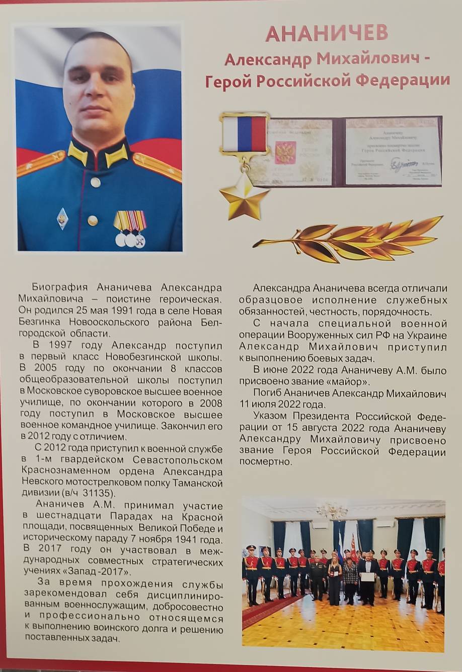 Героями выставки стали – белгородцы, отличившиеся в ходе операции. В экспозиции представлены фотографии и информация о жизненном и боевом пути героев. Среди них старший лейтенант Сергей Аргентов, посмертно награжденный орденом Мужества. Один из стендов посвятили Герою России Александру Ананичеву. Уроженец села Новая Безгинка Новооскольского района Белгородской области майор Александр Ананичев погиб в ходе проведения специальной военной операции на территории Харьковской области.15 августа 2022 года Президент Владимир Путин подписал Указ о присвоении ему звания Героя России посмертно.