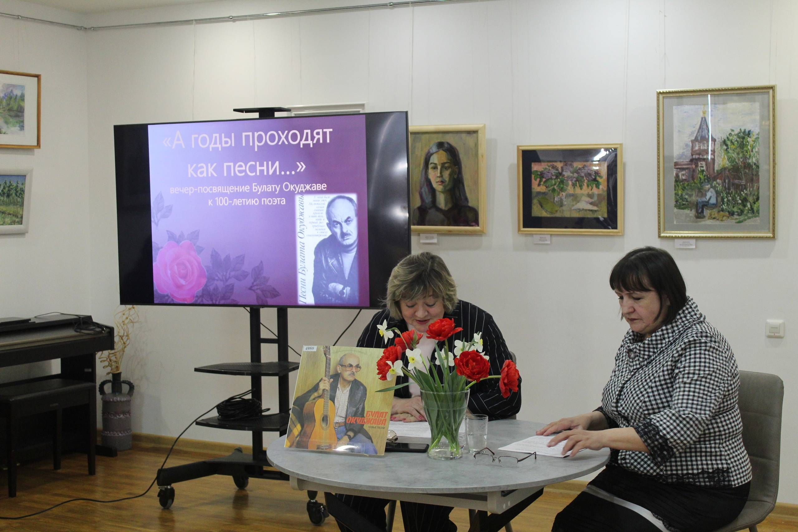 В тёплой дружеской атмосфере прошёл вечер-посвящение 100-летию со дня рождения Булата Шалвовича Окуджавы. Ведущие и участники встречи говорили о жизни и деятельности человека, чьё творчество оказало большое влияние на писателей-современников, на тысячи исполнителей авторской песни, на миллионы слушателей. Приоритет был отдан патриотической лирике поэта. Собравшиеся читали стихи Окуджавы, слушали песни с экрана в исполнении автора, произведения Булата Шалвовича в исполнении других музыкантов. Лиричность, гуманизм и высокий патриотизм творчества Булата Окуджавы современны в настоящее время, поэтому находят своего слушателя и зрителя сегодня.