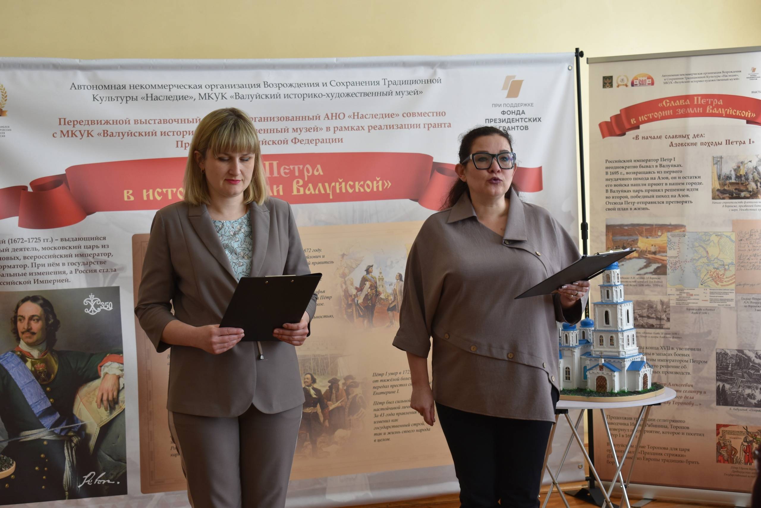 В настоящее время экспозиция развернута в Валуйском историко-художественном музее. На её открытии сотрудники музея, члены РВИО Наталья Лебедева и Марина Липская рассказали о том, как создавался проект. Валуйчане бережно сохраняют все, что связано с пребыванием Петра Первого в Валуйках. Впервые Пётр побывал в Валуйках осенью 1695 года, когда возвращался из неудачного первого азовского похода. А уже после победы во втором Азовском походе в 1699 году царь по государственным делам остановился в городе и проверил, как делают селитру для изготовления пороха у местного купца-промышленника Гаврилы Торопова. По одной из версий, во время своих визитов царь останавливался у местного священника Прокопия Зиновьева, после этого народ назвал его дом «Домиком Петра Первого». Строение не сохранилось до наших дней, сгорело в пожаре 1934 года. Пётр пожаловал средства на строительство пятиглавого деревянного храма в Валуйках, о чём упоминалось в надписи над главным входом собора. В 1861 году построили новый каменный собор, а деревянный храм продали в село Большие Липяги. Деревянный храм также не сохранился, его разобрали в 30-е годы прошлого века.