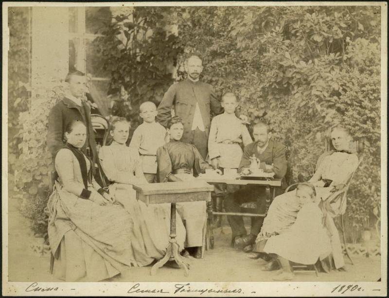 Описание звучит так: «Снимок выполнен в летнее время. Перед домом во дворе стоят два чайных столика. На одном из них стоит посуда. Вокруг них расположилась группа людей (взрослые и дети). Четыре женщины сидят на венских стульях. Они одеты в длинные платья: верх с глухим воротом и длинными рукавами, низ состоит из нескольких ярусов. Трое мужчин и трое детей: два мальчика и одна девочка».