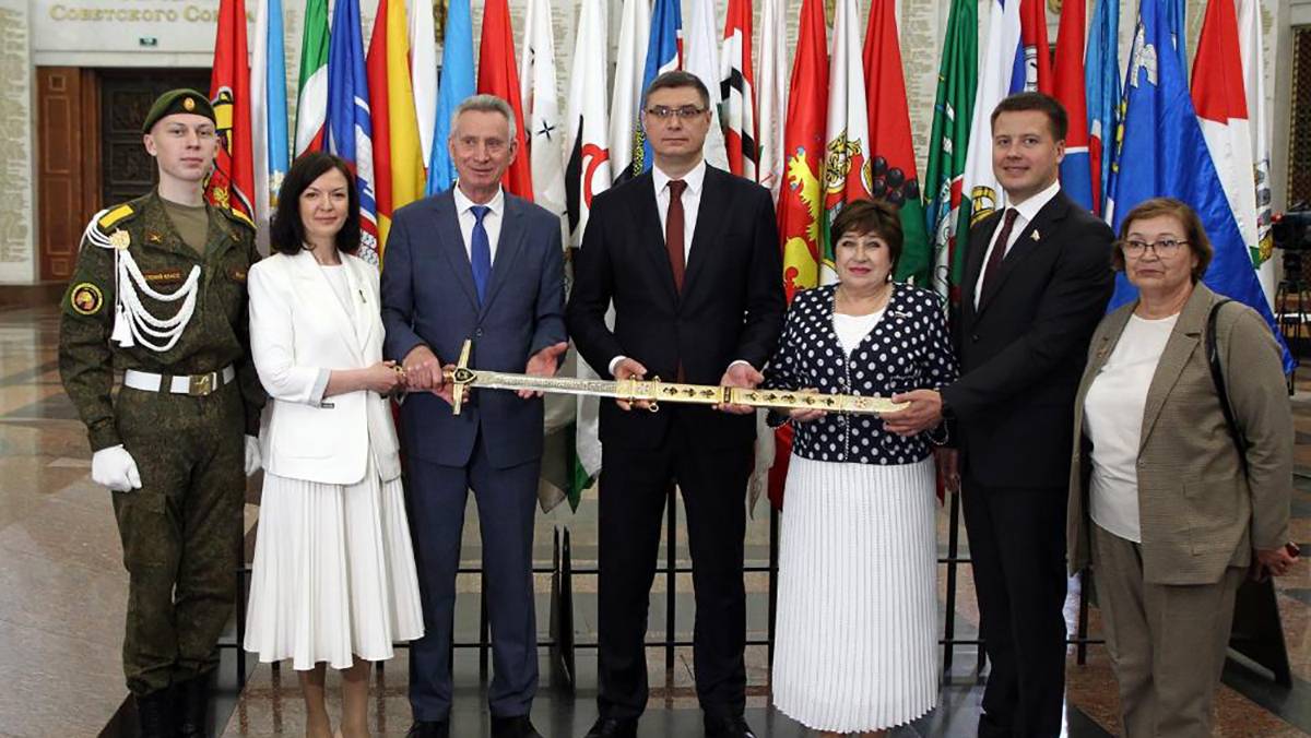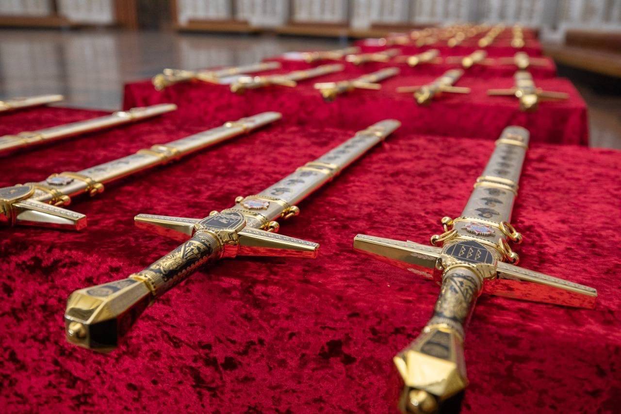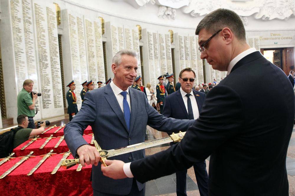 Мечи вручены представителям 45 городов Воинской славы. Они были изготовлены вручную мастерами Златоустовской оружейной компании и соответствуют государственному стандарту клинкового оружия. Изделия украшены растительным орнаментом и дарственной надписью для каждого города с одной стороны и высеченной на другой стороне цитатой князя Александра Невского: «Кто с мечом к нам придёт, тот от меча и погибнет». На цельнометаллических ножнах выгравирован Орден Победы и портреты русских полководцев. Вес каждого меча – 4,5 килограмма, длина клинка – 1 метр, а рукояти – 20 сантиметров.