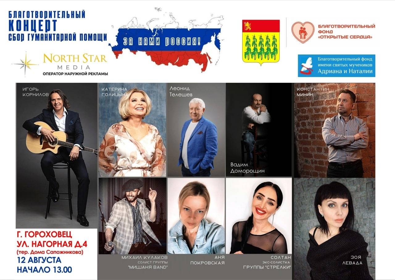 Во Владимирской области при поддержке благотворительного фонда «Открытые сердца» в августе проходит серия концертов, организованных общественно-патриотическим движением российских музыкантов, деятелей искусства и спорта в поддержку специальной военной операции на Донбассе «За нами Россия!»