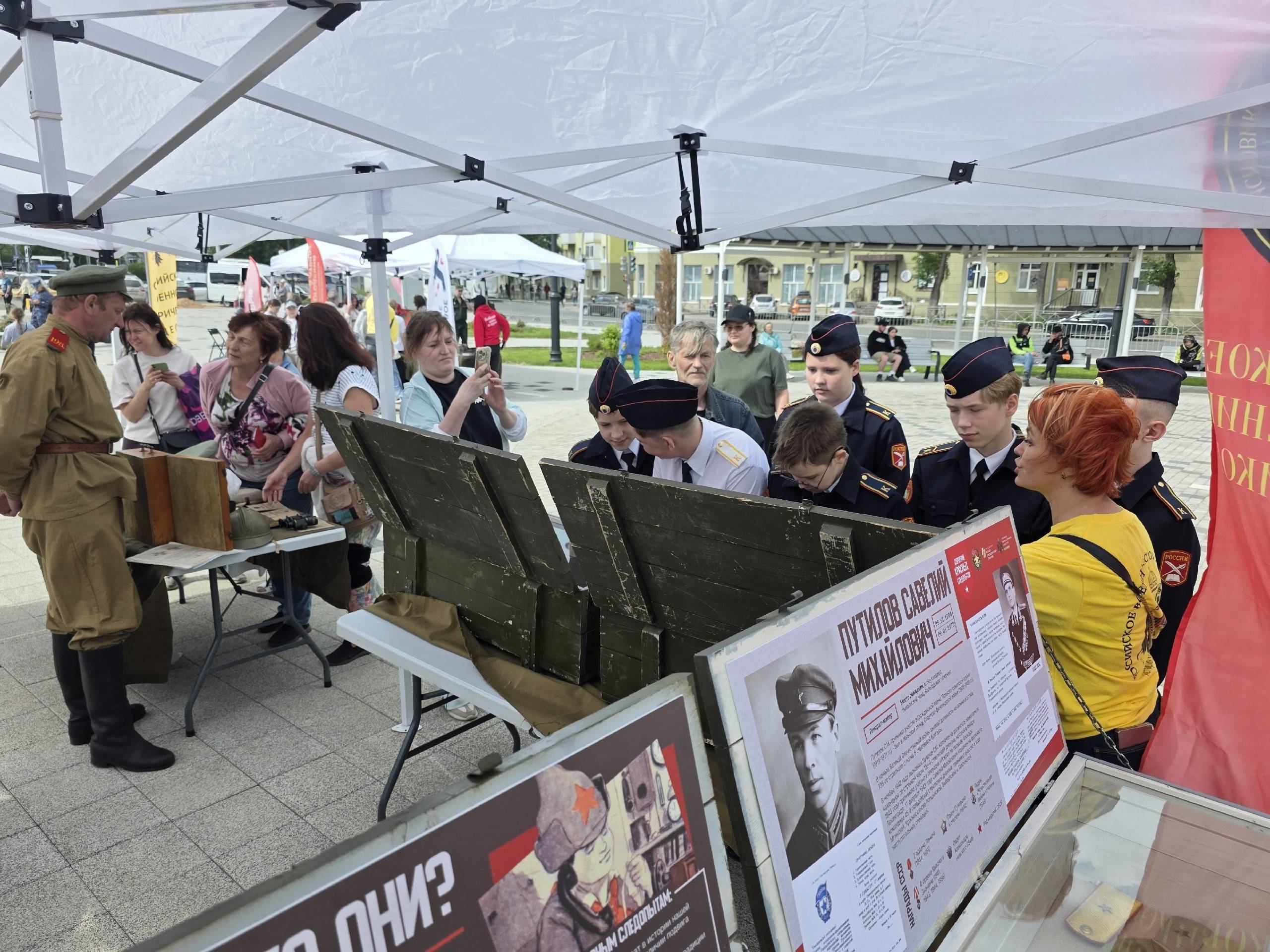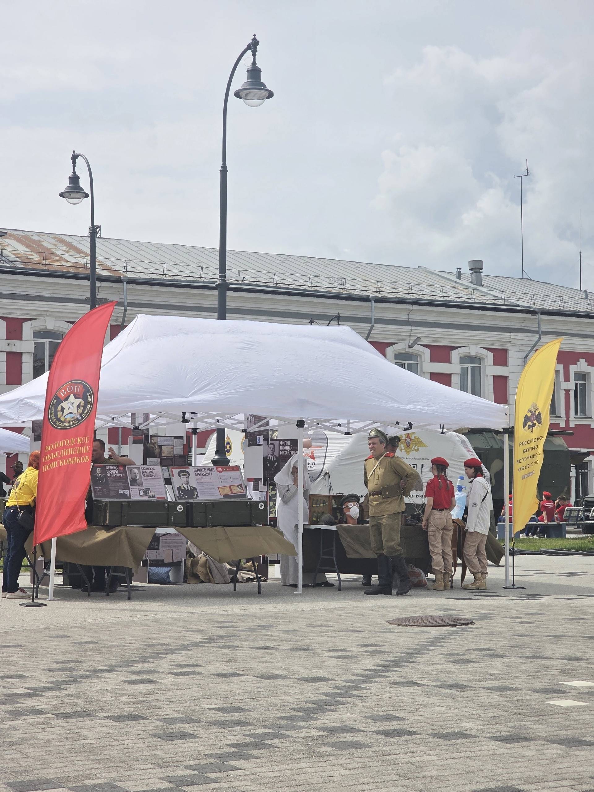 Вчера в Вологду прибыл агитационный поезд Министерства обороны «Единство в памяти. Сила в подвиге!» Перед вокзалом развернулись интерактивные площадки патриотических организаций Вологды.