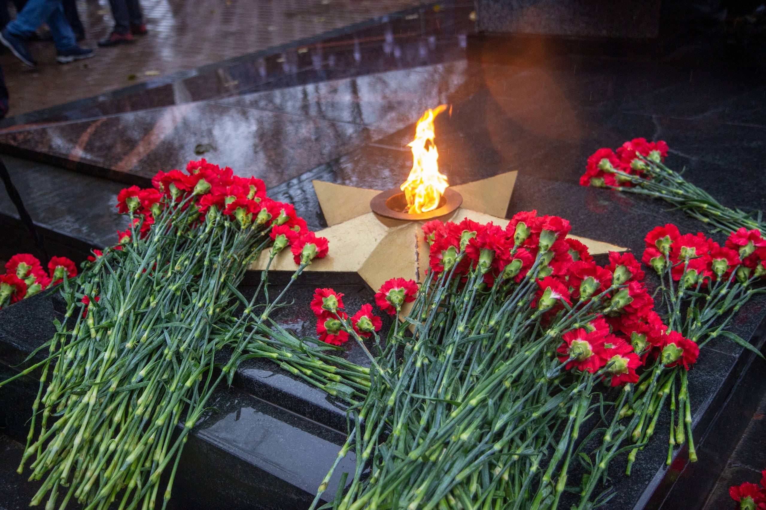 После минуты молчания почетная группа караула выставила венки к мемориалу, а участники церемонии возложили цветы к подножию памятника.