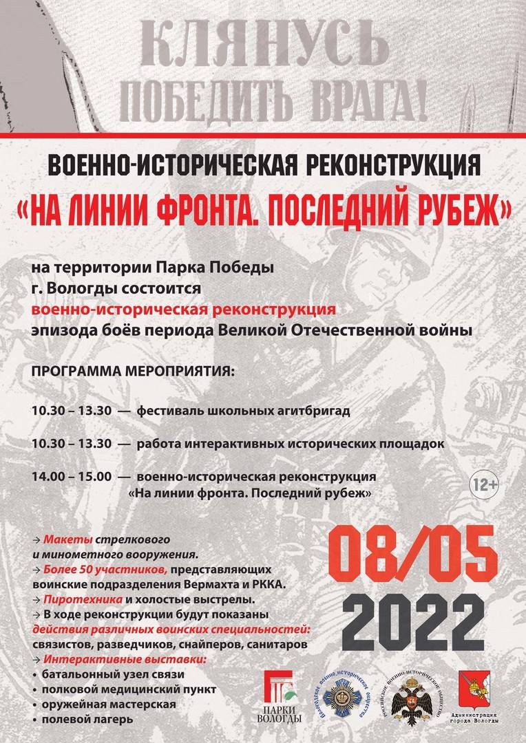 В рамках мероприятий, посвященных празднованию Дня Победы, 8 мая, в Парке Победы была организована военно-историческая реконструкция эпизода боев периода Великой Отечественной войны «На линии фронта. Последний рубеж». Её организатором выступило Вологодское отделение Российского военно-исторического общества.