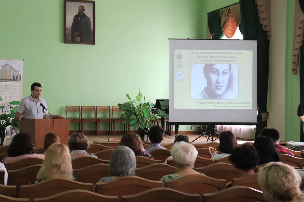 26 июля в Воронежской областной универсальной научной библиотеки им. И. С. Никитина состоялась лекция члена Регионального отделения Российского военно-исторического общества в Воронежской области, ассистента кафедры зарубежной истории Воронежского государственного педагогического университета Самойлова Дмитрия Александровича на тему «О героизме советской молодёжи в годы Великой Отечественной войны» (на примере Зои Космодемьянской).