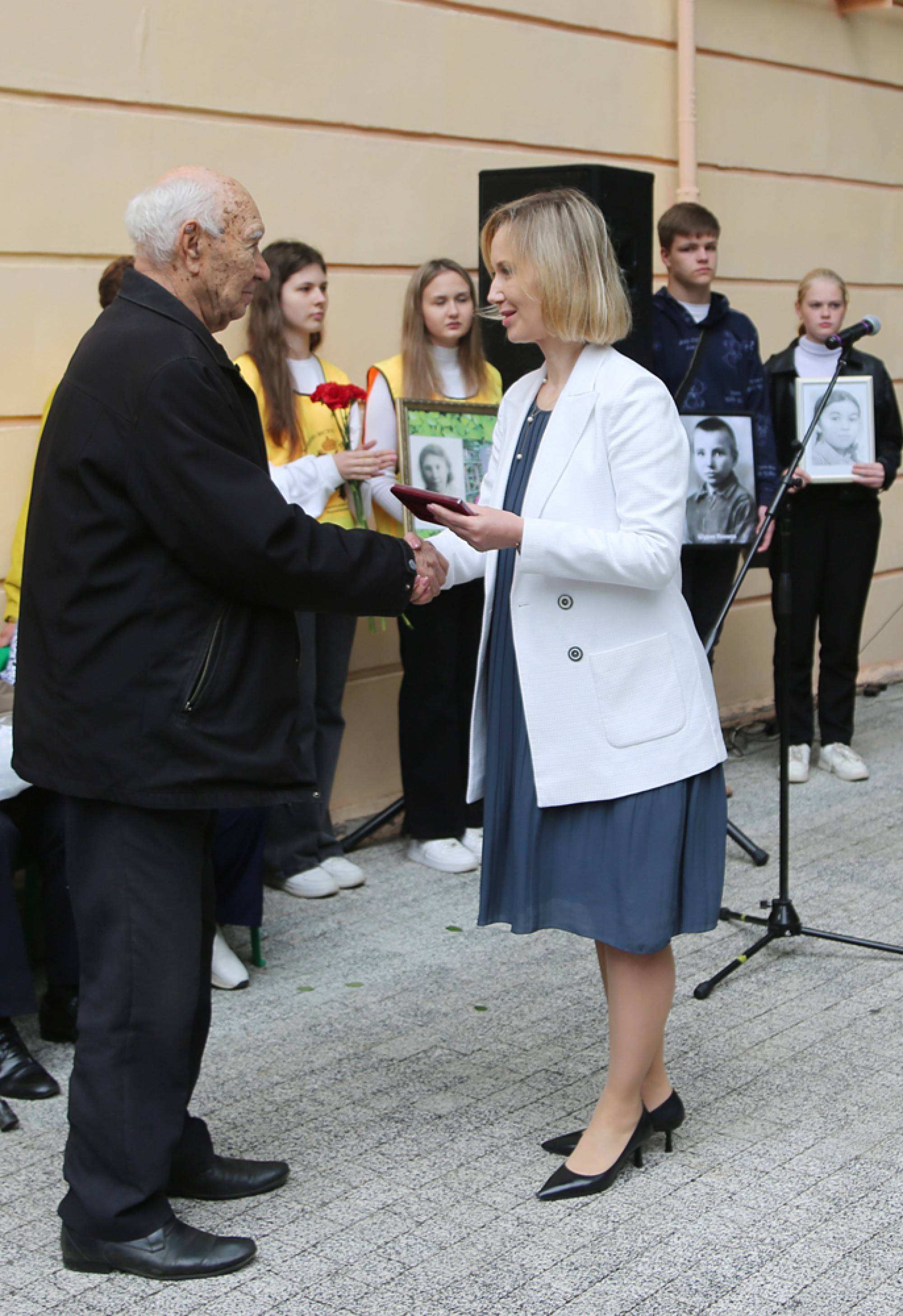 И. о. заместителя главы администрации по социальной политике Л.А. Кулакова и руководитель управления культуры городского округа город Воронеж А.В. Харитонов вручили очевидцам трагедии памятные знаки «Воронеж – город воинской славы» за большой личный вклад в сохранение памяти. Березянская Ольга Александровна – пострадавшая от бомбежки Сада пионеров, бывший научный сотрудник, заместитель заведующего лабораторией селекции озимой пшеницы НИИС им. Докучаева, ветеран Воронежского государственного сельскохозяйственного института им. Глинки (ст. лаборант кафедры, 1976-2001), Слепых Евгений Федорович – театральный педагог, режиссер, профессор, декан театрального факультета Воронежской государственной академии искусств (1972-2020), Заслуженный артист РФ, Коваленко Владимир Васильевич – кандидат технических наук, ветеран Воронежского завода «Гипрокаучук», бывший директор завода по научной части, Заслуженный химик РФ, лучший изобретатель Миннефтехимпрома СССР.