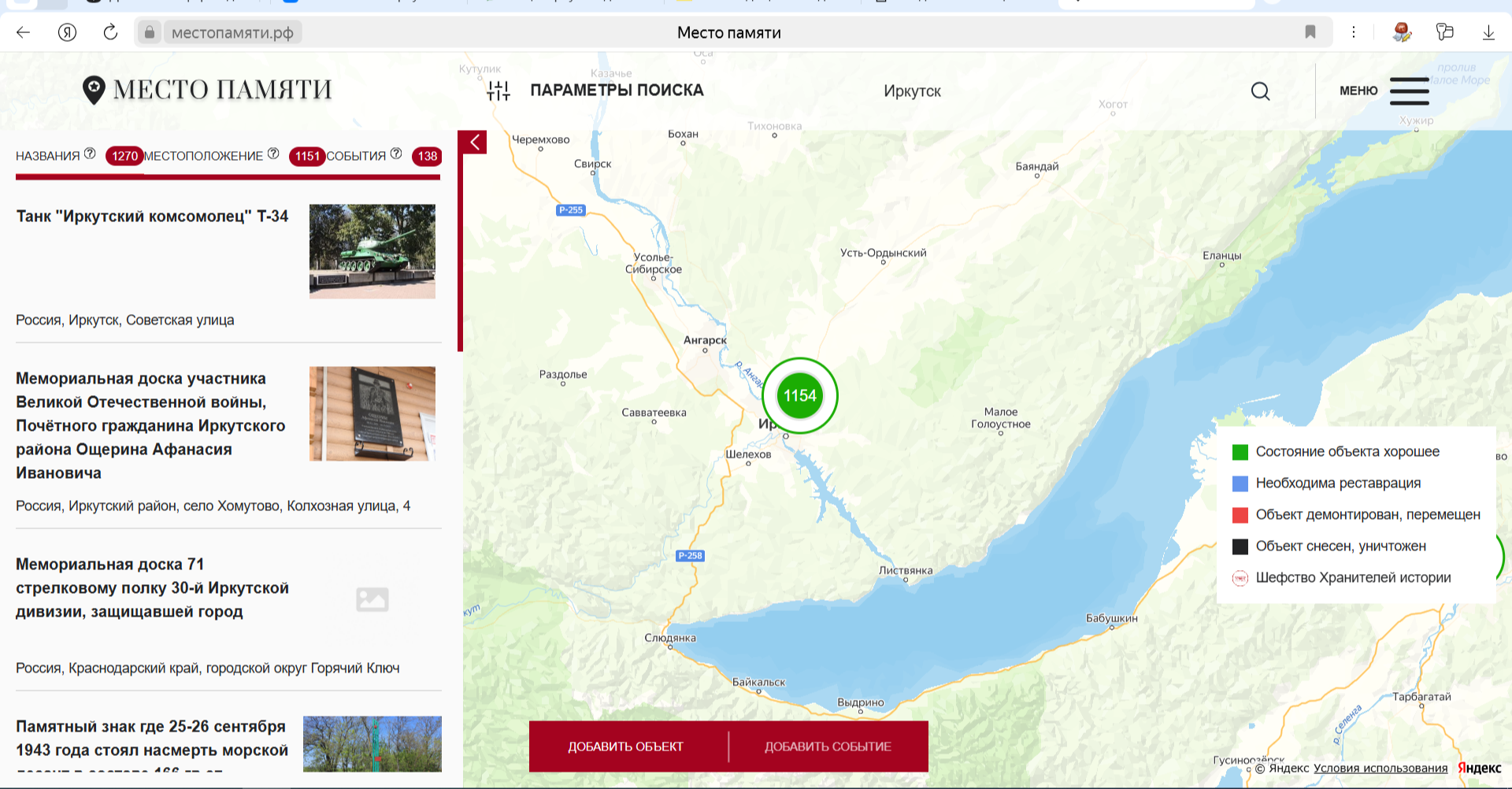 - В Иркутской области работа по инвентаризации памятных мест идет активно. Внесено уже более двух тысяч объектов. Огромную работу провели муниципалитеты, общественные, ветеранские организации, - рассказал председатель Регионального отделения Российского военно-исторического общества в Иркутской области Андрей Южаков. - Наша задача, не просто внести объект в список или на карту, а, по факту, еще раз вспомнить о нем, узнать его техническое состояние и сделать так, чтобы об этом памятном месте никогда не забывали и чтобы у каждого такого мемориала, памятника или братской могилы появился свой куратор.