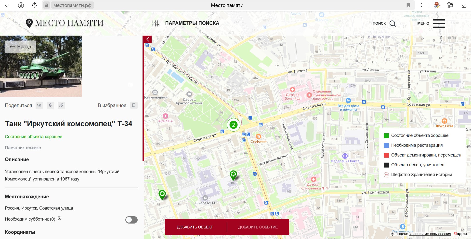После регистрации в личном кабинете необходимо перейти в меню в правом верхнем углу, далее в разделе «Объекты» выбрать строку «Карта мест памяти», после этого на странице с картой внизу в центре выбрать кнопку «Добавить объект». После этого идет непосредственное заполнение информации о самом объекте. Как только все выполнено, сайт направит информацию на проверку и публикацию.