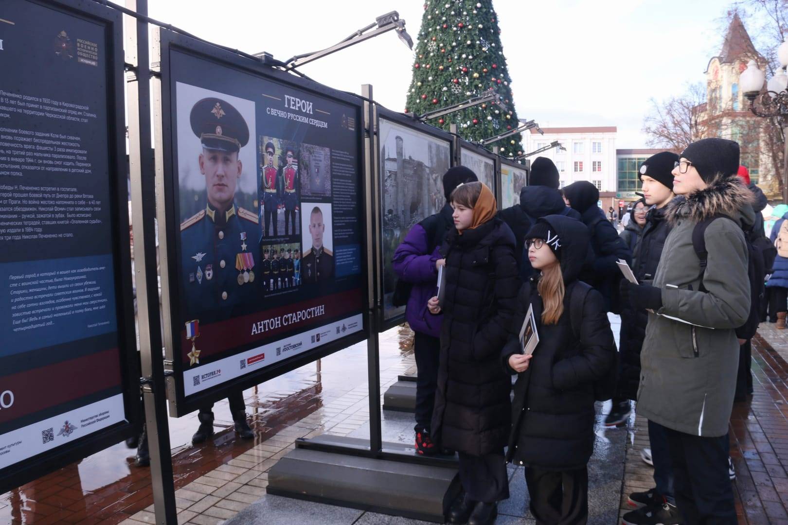 8 декабря на площади Победы в Калининграде в преддверии Дня Героев Отечества открылась выставка «Герои с вечно русским сердцем». На 30 стендах представлены уникальные фотографии, копии наградных документов и информация о жизненном и боевом пути героев разных времён.