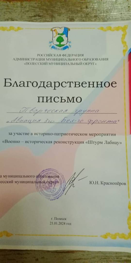 По итогам проведённой работы, членам РВИО было вручено благотворительное письмо от администрации Полесского муниципального округа.