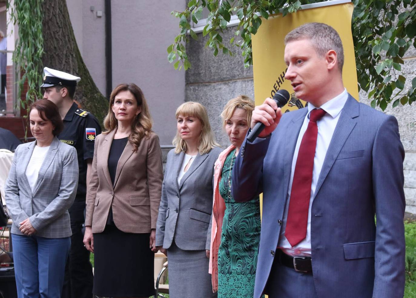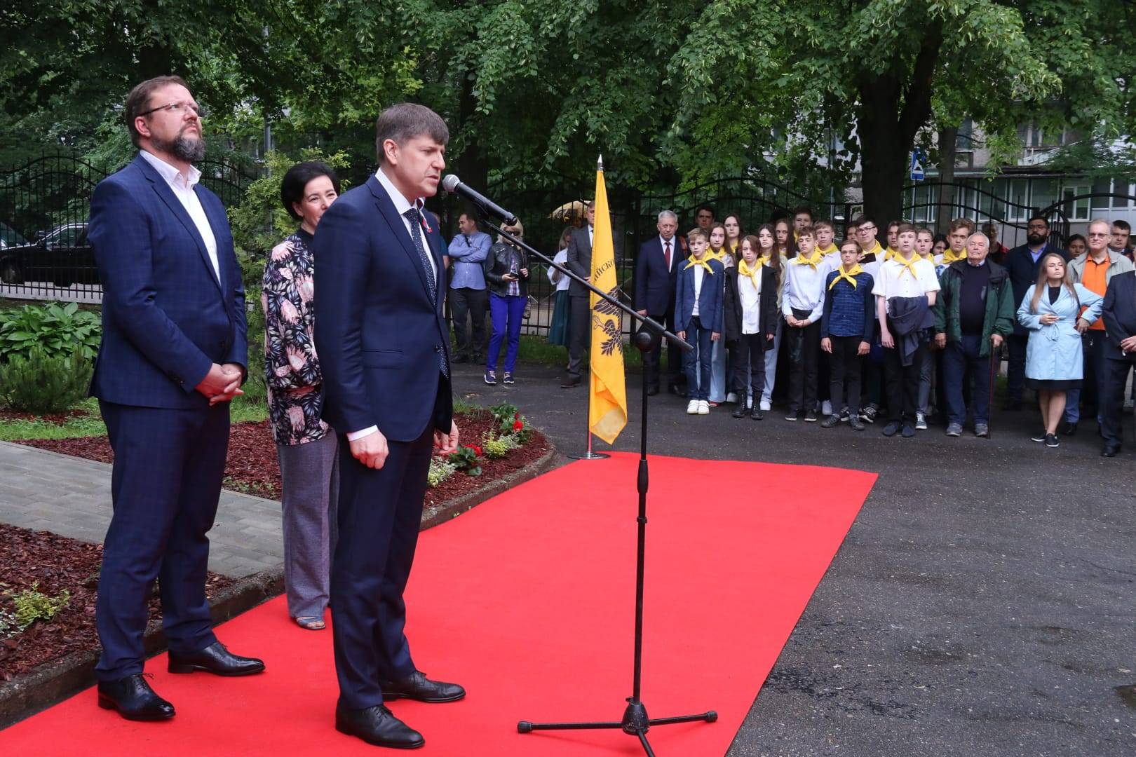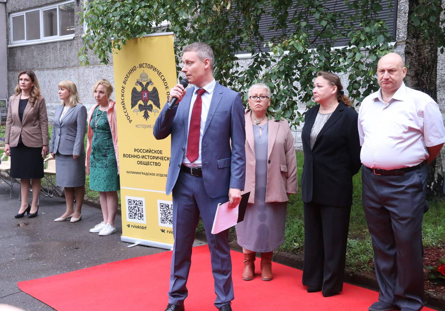 В церемонии открытия мемориальной доски приняли участие: Балашов Роман Викторович – заместитель полномочного представителя Президента Российской Федерации в Северо-Западном Федеральном округе, Кропоткин Андрей Михайлович – председатель Законодательного Собрания Калининградской области, Баринов Илья Александрович – заместитель Председателя Правительства Калининградской области, Ермак Андрей Викторович – министр по культуре и туризму Калининградской области, Дятлова Елена Ивановна – глава администрации городского округа «Город Калининград», другие представители Правительства области и администрации города, члены Российского военно-исторического общества, учащиеся калининградских школ, кадеты, юнармейцы и местные жители. В роли ведущего выступал Петунин Константин Борисович – исполнительный директор регионального отделения Российского военно-исторического общества.