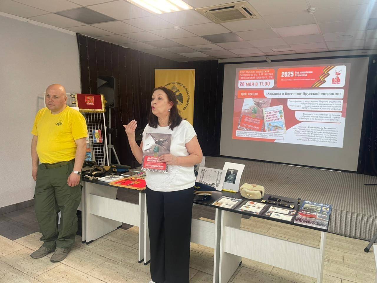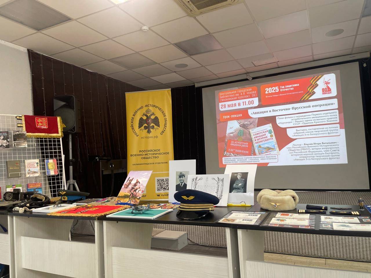 28 мая в Калининграде в Центральной городской библиотеке имени А.П. Чехова в рамках просветительской деятельности Регионального отделения Российского военно-исторического общества прошёл открытый урок-лекция «Авиация в Восточно-Прусской операции». О действиях советской авиации в Восточно-Прусской наступательной операции Красной Армии, о штурме города-крепости Кёнигсберга учащимся 8-х и 10-х классов лицея № 23 рассказал член РО РВИО, ветеран Совета морской авиации Балтийского флота, координатор творческой группы «Авиация 3-го Белорусского фронта» Игорь Ялычев. В проведении мероприятия приняли участие также главный библиотекарь ЦГБ им. А.П. Чехова Елена Котова и член РО РВИО и творческой группы Игорь Дуплинский.