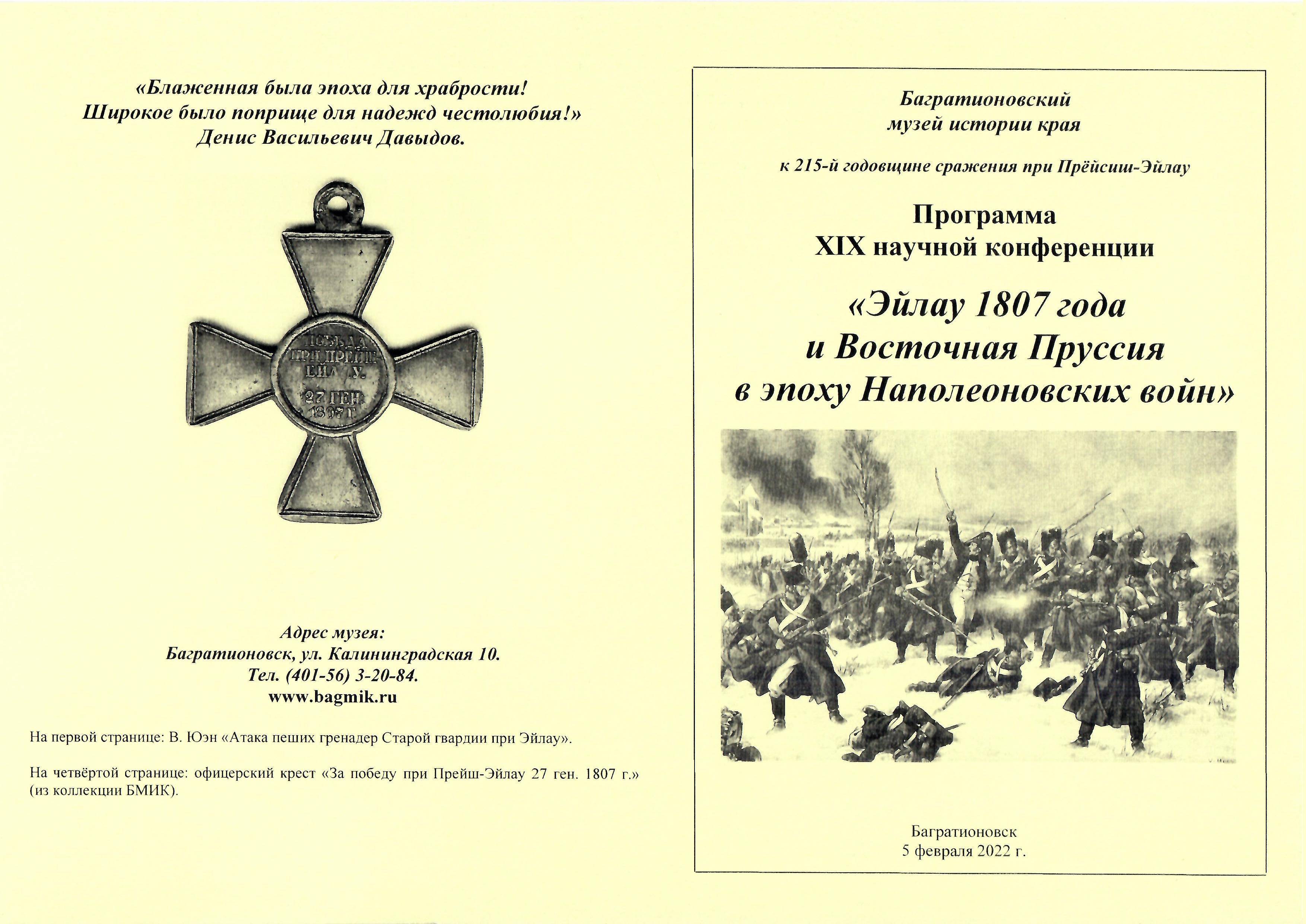 5 февраля 2022 года, в г. Багратионовск, на базе Багратионовского музей истории края, состоялась XIX научная конференция "Эйлау 1807 года и Восточная Пруссия в эпоху Наполеоновских войн", посвящённая 215-й годовщине сражения при Прёйсиш-Эйлау 1807 года.