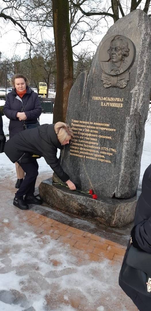 На этот раз участниками поездки стали руководители образовательных учреждений, члены Ассоциации образовательных учреждений Калининградской области. Началась поездка с возложения цветов у памятного знака генерал-фельдмаршалу П.А.Румянцеву-Задунайскому.