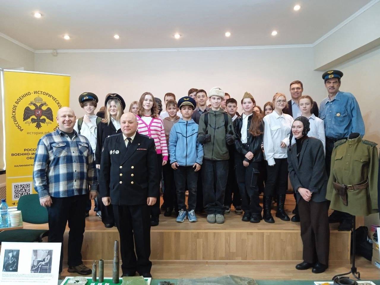 Заместитель руководителя городского отделения РВИО Белоус Игорь Владимирович, представители Калининградского регионального отделения Российского военно-исторического Игорь Ялычев, Павел Угрюмов, Елена Угрюмова, Игорь Дуплинский провели в Доме культуры "Машиностроитель" микрорайона им. Александра Космодемьянского встречу с учащимися МАОУ СОШ № 9.