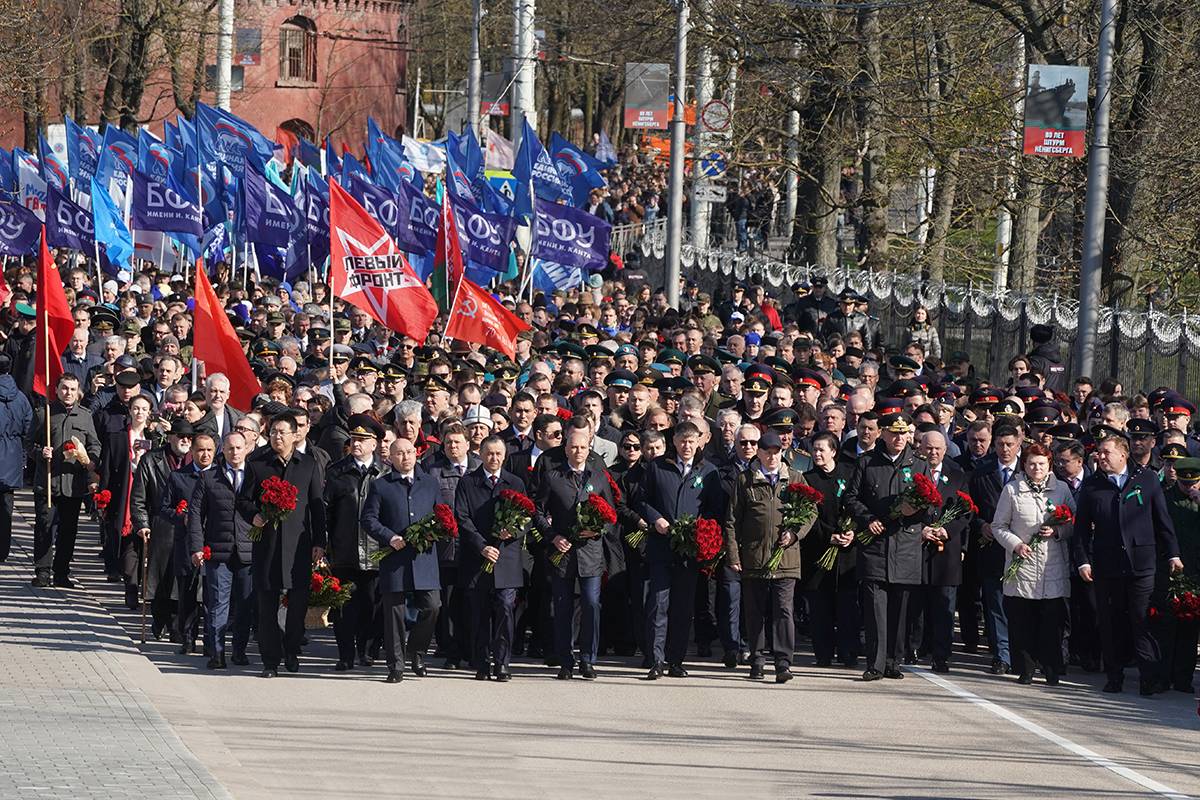 Губернатор Алексей Беспрозванных вместе с калининградцами и почётными гостями прошёл в колонне к мемориальному комплексу 1200 воинам 11-й гвардейской армии, чтобы почтить память героев, штурмовавших город-крепость 80 лет назад.