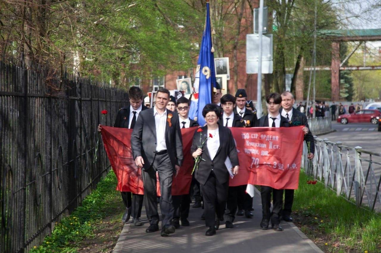 Учащиеся лицея несли в руках гвоздики и портреты своих дедов и прадедов, воевавших с фашизмом в Великую Отечественную Войну.