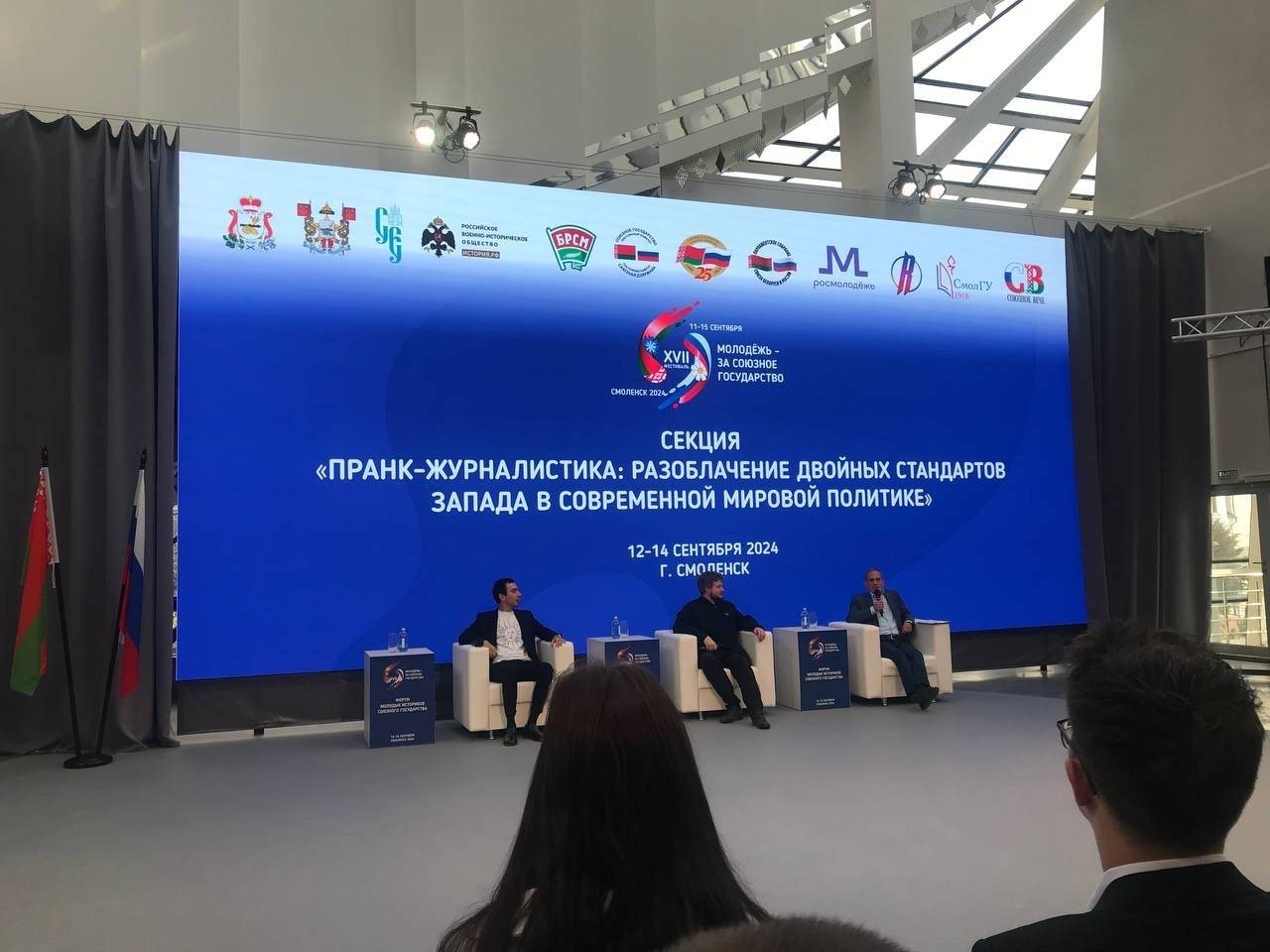 На мероприятии, организованном Российским военно-историческим обществом, выступали члены парламентского собрания Союзного государства - обсуждалась проблема единого учебника по истории. Кроме того, выступали известные пранкеры Вован и Лексус.