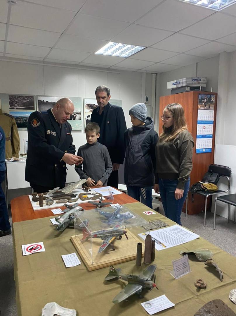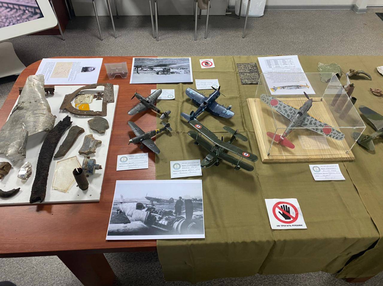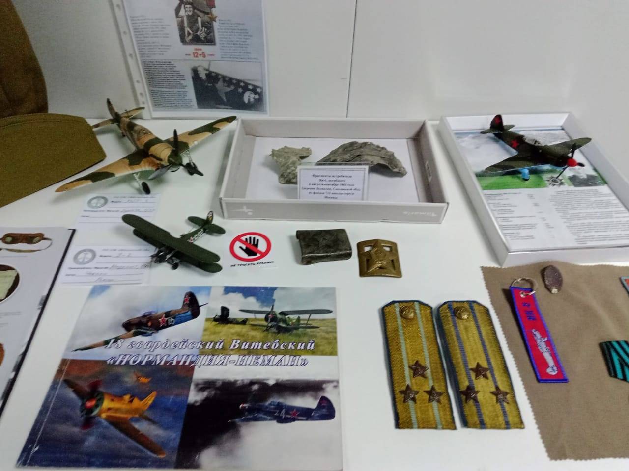 В экспозиции представлены элементы формы советских , французских и немецких лётчиков, печатные издания на русском и французском языках, фрагменты самолётов поднятых поисковыми отрядами, качественные стендовые модели.