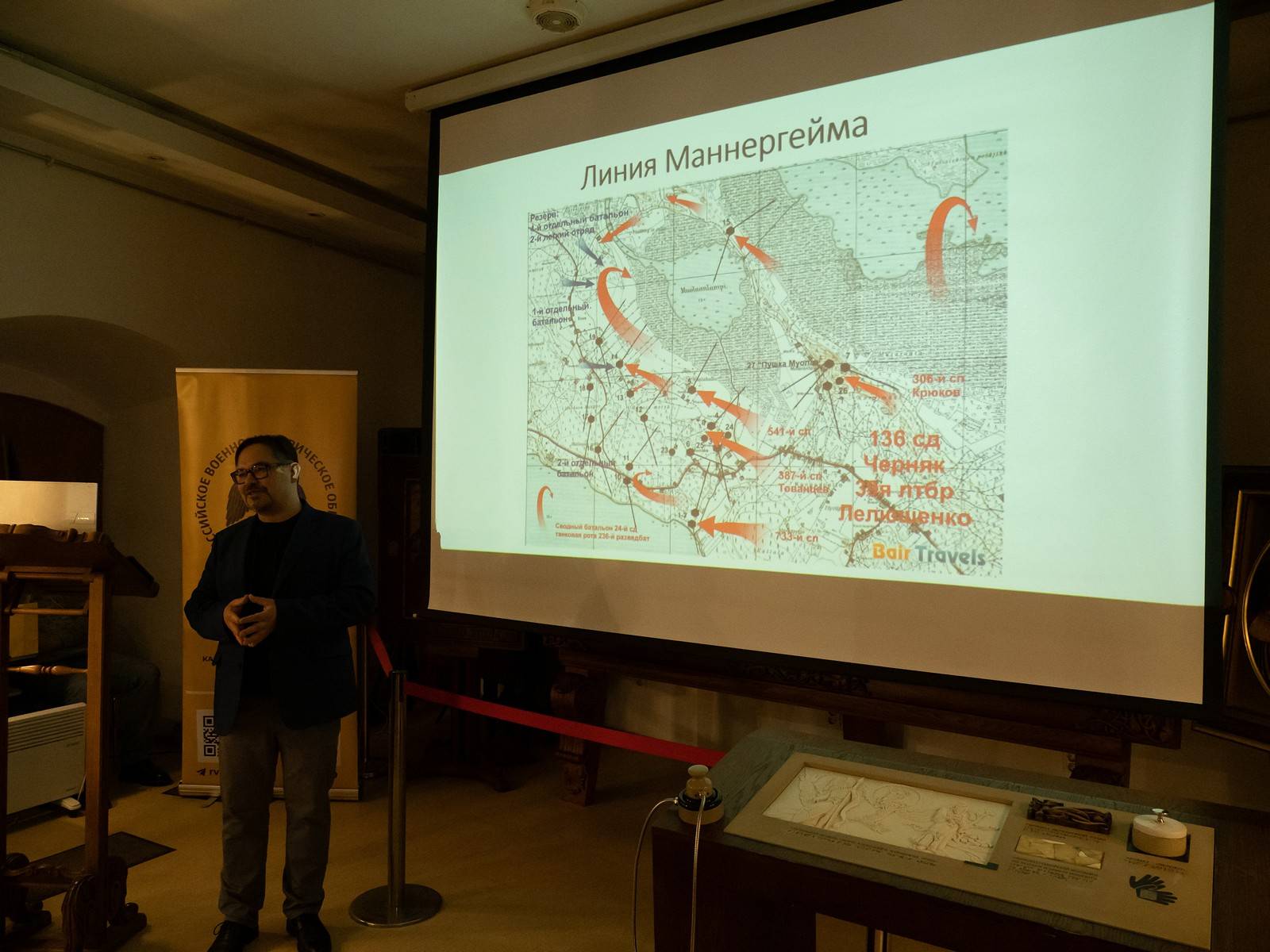 В Калининградском музее янтаря состоялась лекция Баира Иринчеева, российского военного историка, публициста, директора Военного музея Карельского перешейка, члена научного совета Российского военно-исторического общества. Баир Климентьевич рассказал о том, как во времена советско-финской войны РККА удалось прорвать линию обороны Финляндии. Пришедшие узнали о фортификации, созданной в 20-е и 30-е годы ХХ века на финской границе.