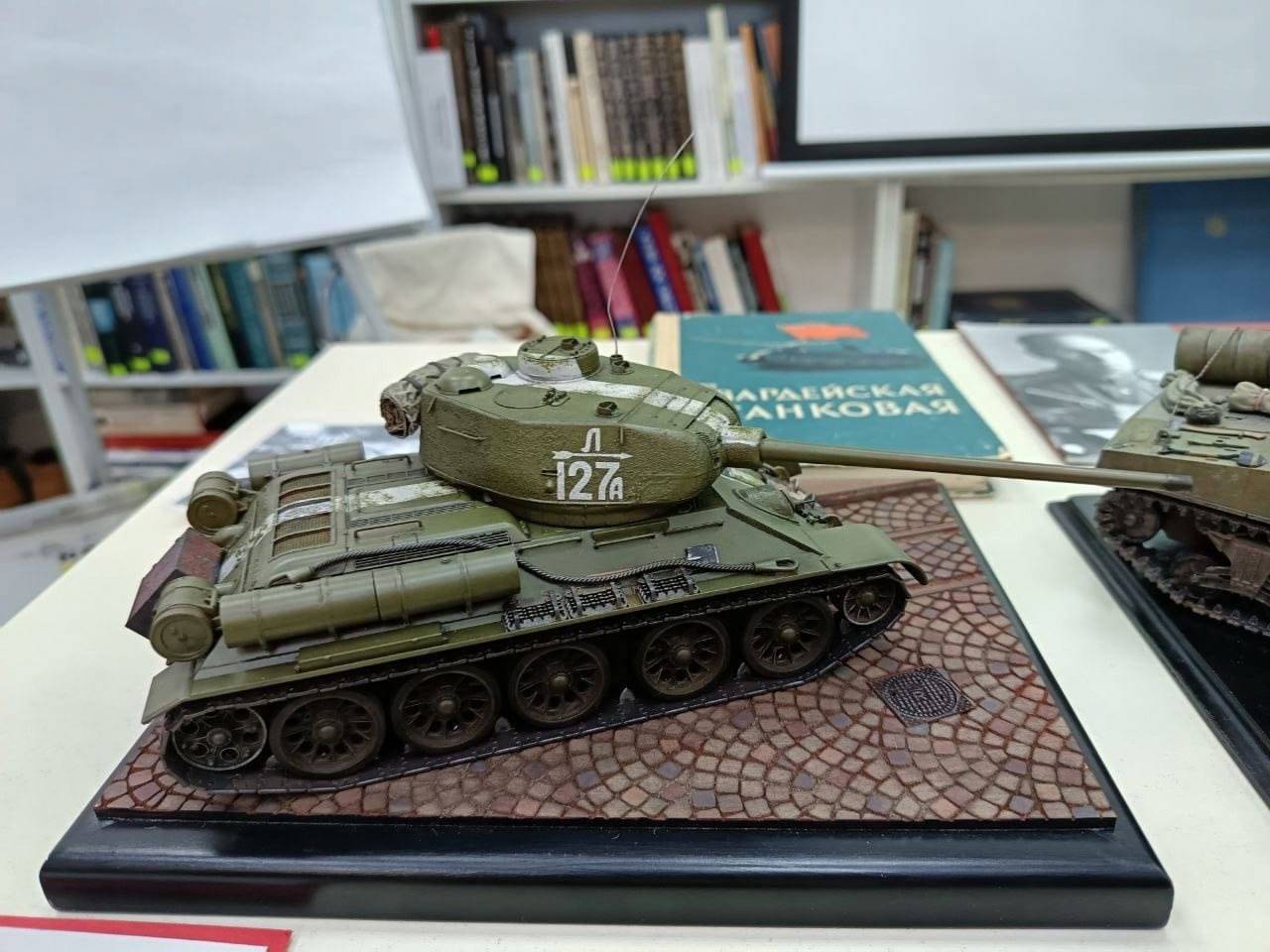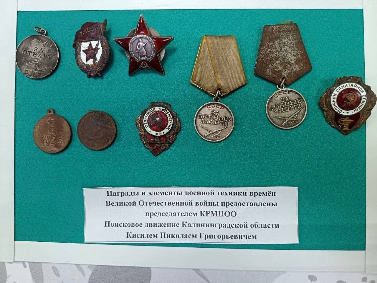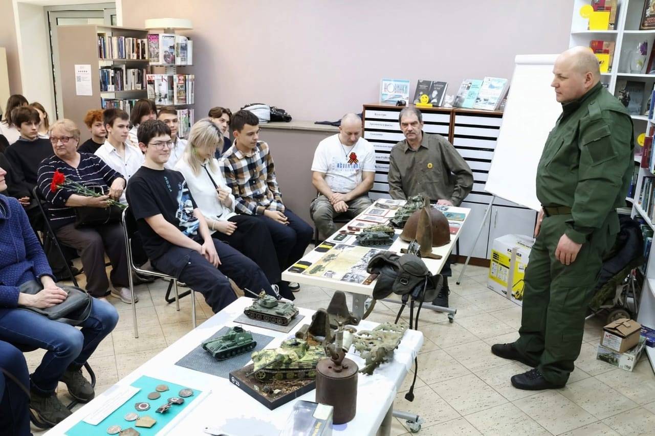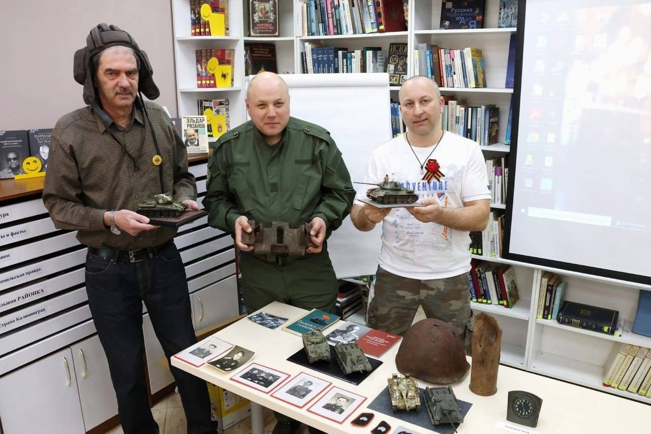 В завершение встречи присутствующим была представлена выставка на тему беседы-лекции: модели танков и самоходных орудий, фотографии фронтовиков-танкистов, погоны советского танкиста образца 1943 года, шлемофон, танковые часы и другое. В числе прочего были показаны награды и элементы военной техники времён Великой Отечественной войны, временно предоставленные председателем поискового движения Калининградской области Николаем Кисилем.