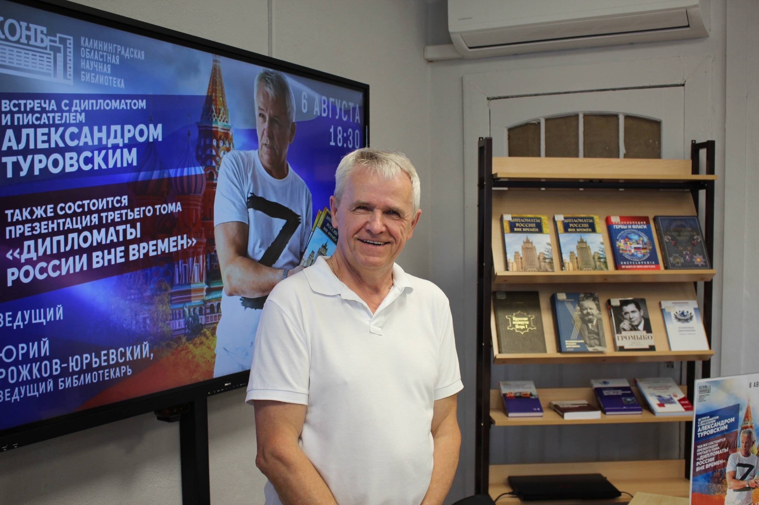 В Калининградской областной научной библиотеке состоялась вторая встреча с известным российским дипломатом Александром Евгеньевичем Туровским, автором книг по истории, православию, страноведению и дипломатии. Во время первого приезда в Калининград в прошлом году почётный работник МИД России и член Союза писателей России подарил библиотеке несколько своих изданий, включая два тома нового труда «Дипломаты России вне времен».