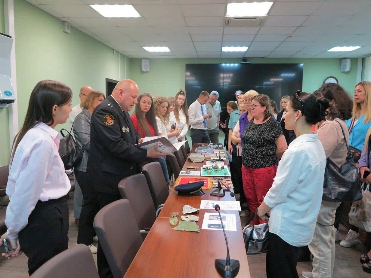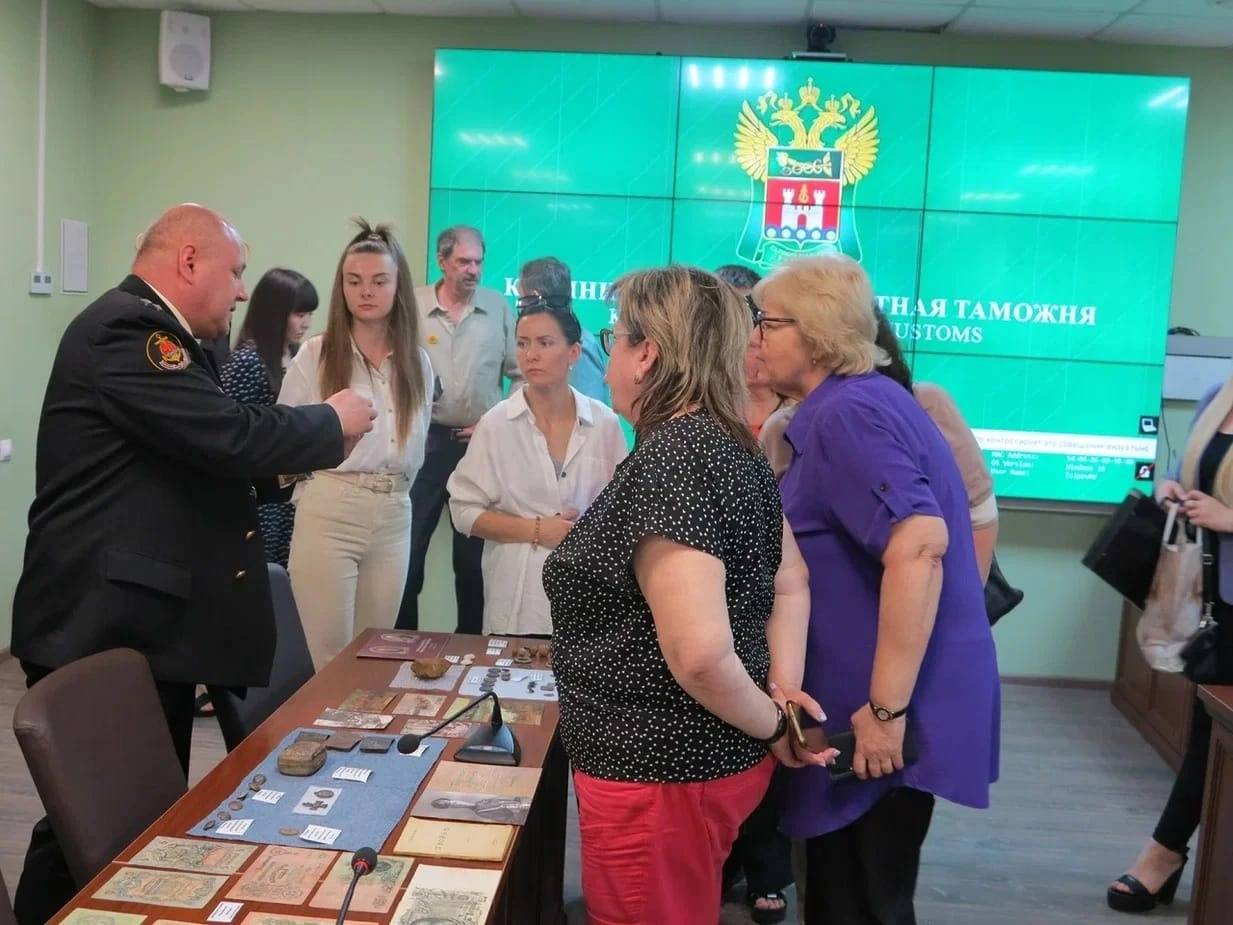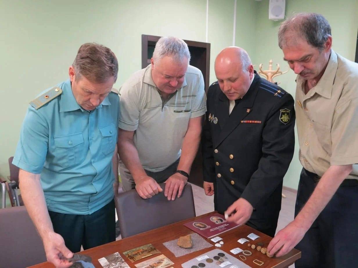 Сотрудникам таможни были представлены элементы выставки, которую члены творческой группы "Авиация 3-го Белорусского фронта" демонстрируют на проводимых ими мероприятиях. В частности, монеты и предметы амуниции периода Семилетней войны. Предметы амуниции, свинцовые пули и фрагмент ядра, найденные на поле Фридландского сражения 1807 года. Русские медные монеты времён Отечественной войны 1812 года и дореволюционные открытки на тему этой войны. Георгиевский крест 4-й степени и Георгиевская медаль 4-й степени "За храбрость", предметы амуниции, бумажные деньги периода Первой мировой войны. Фрагменты советских самолётов, найденных поисковиками на территории нашей области. И многое другое. Подготовил выставку член РО РВИО и творческой группы Игорь Евгеньевич Дуплинский.