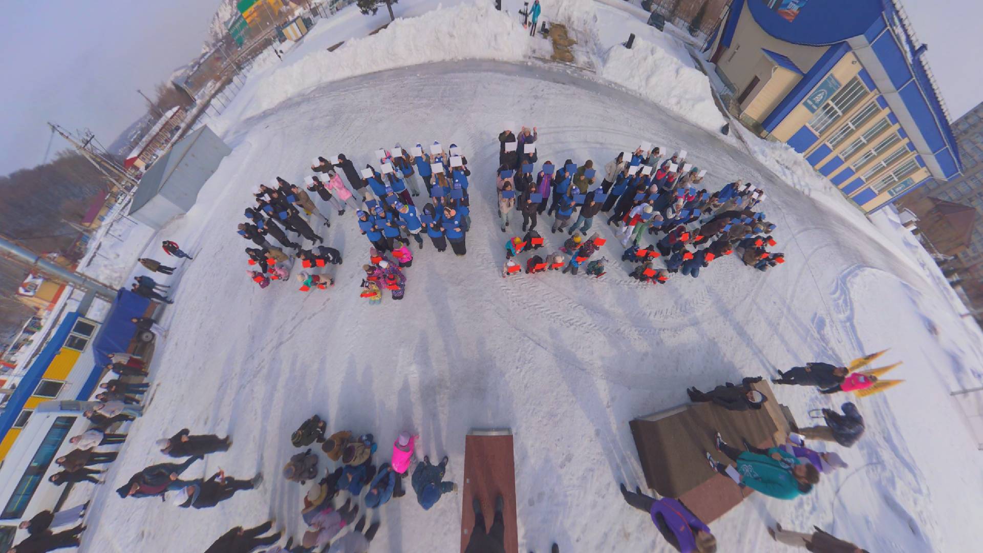 Волонтеры и активисты выстроились в слова «Крым», держа в руках таблички цветов российского триколора.