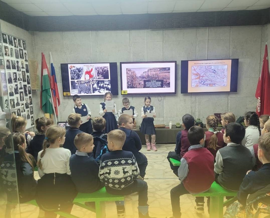 Учащиеся второго класса средней общеобразовательной школы имени генерала Захаркина И. Г. выступили с рассказом о событиях 1941 года перед учащимися средней общеобразовательной школы им. Е. Р. Дашковой, которые в свою очередь прочитали стихи, посвященные подвигу наших бойцов во время Великой Отечественной войны.