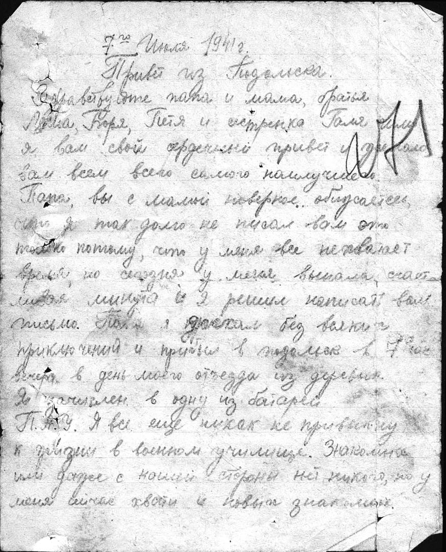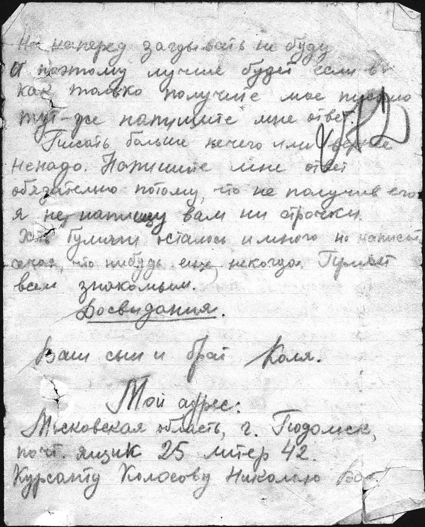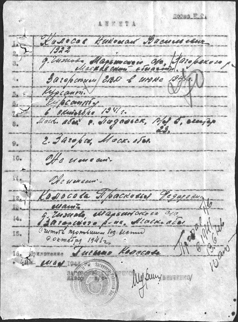 На фото копии: анкета по Колосову Н. В. (Загорский РВК, 1946г.), письмо курсанта Николая Колосова родным от 07 июля 1941г. на трех страницах, крышка от котелка с надписью, найденная в ходе поисковых работ у ДОТа № 3, страница из Книги памяти по Московской области с данными по Колосову Н. В.