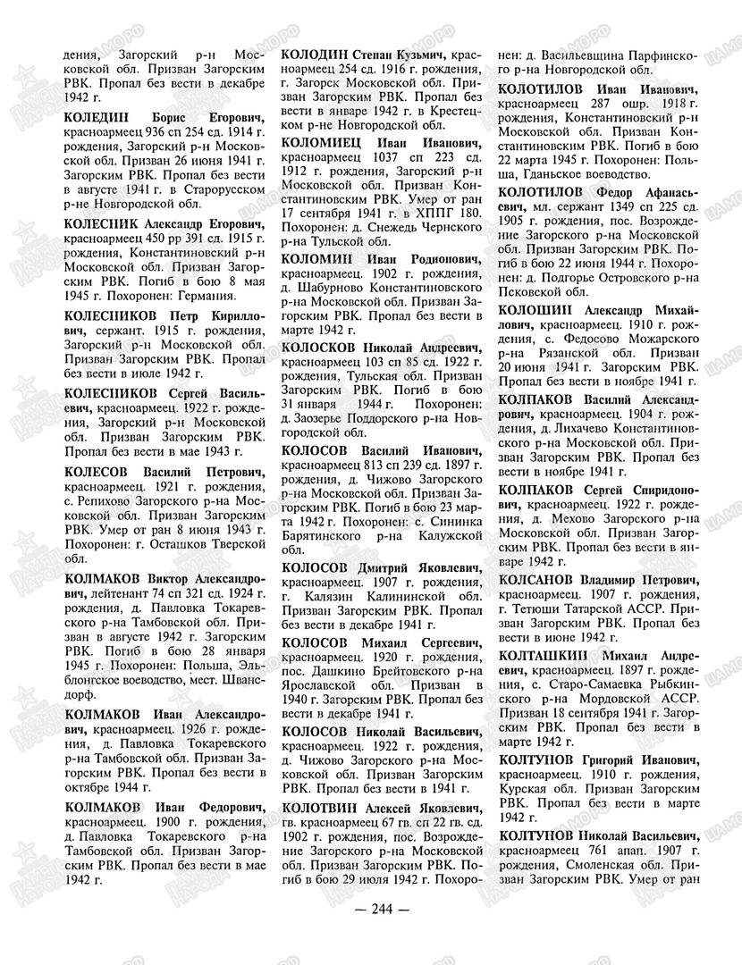 Колосов Николай Васильевич родился в д. Чижово Загорского района Московской области в 1922г. В июне 1941г. был призван Загорским ГВК и направлен в Подольское артиллерийское училище (ПАУ) - зачислен 16 июня. В составе сводного полка ПАУ участвовал в боях на Ильинском рубеже обороны в октябре 1941г. (7-я батарея под командованием лейтенанта Горячих находилась на открытых позициях южнее Варшавского шоссе в с. Ильинском). Был направлен в подчинение ст. политрука ПАУ Лепехина Ф. И. на пополнение гарнизона артиллерийского ДОТа № 3 с противотанковой 45-мм пушкой. В соответствии с данными ЦА МО числился пропавшим без вести с октября 1941г.