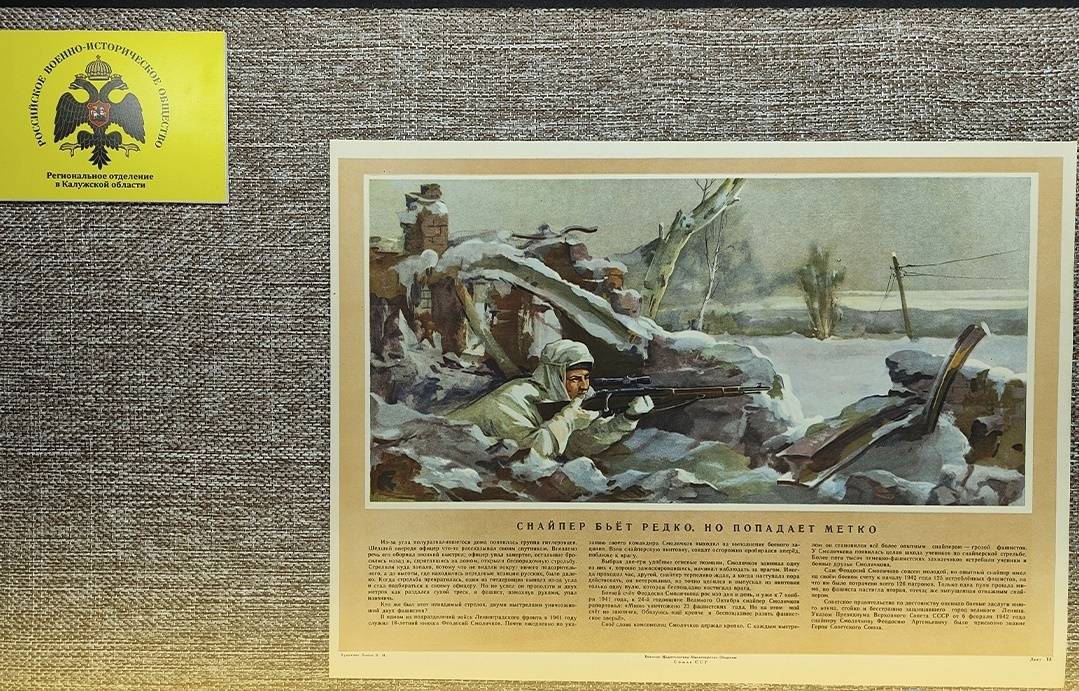 На выставке представлены 5 репродукций работ советских художников на тему Великой Отечественной войны из коллекционного альбома «Героические подвиги советских воинов во славу Родины» - 1956 года.