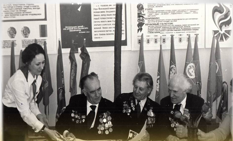 На фото: ветераны Подольских военных училищ на встрече с пионерами дружины школы № 11 г. Обнинска. Слева направо: Полковников Л. А., Гусев Н. И. (проживал в Калужской области), Ларин П. И. (проживал в г. Обнинске).