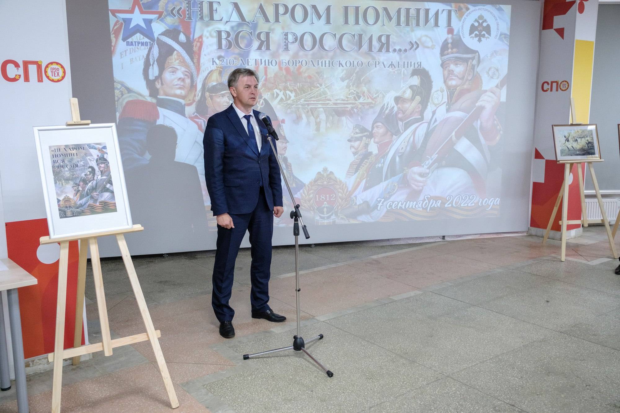 Сегодня, открывая эту выставку, важно, чтобы вы вспомнили те годы, когда наши предки отстояли независимость России против самой, на тот момент, могущественной французской армии Наполеона, которая захватывала страны Европы. Бородино – это переломный момент Отечественной войны 1812 года. Бородинскому сражению посвящены строки в литературных произведениях Михаила Лермонтова и Льва Толстого. Сейчас, в этот сложный период, когда идет специальная военная операция, нам необходимо вспоминать эти исторические события и проводить аналогию с сегодняшним днем. Уверен, что эта выставка послужит делу патриотического воспитания молодежи, - обратился Роман Береснев к присутствующим.
