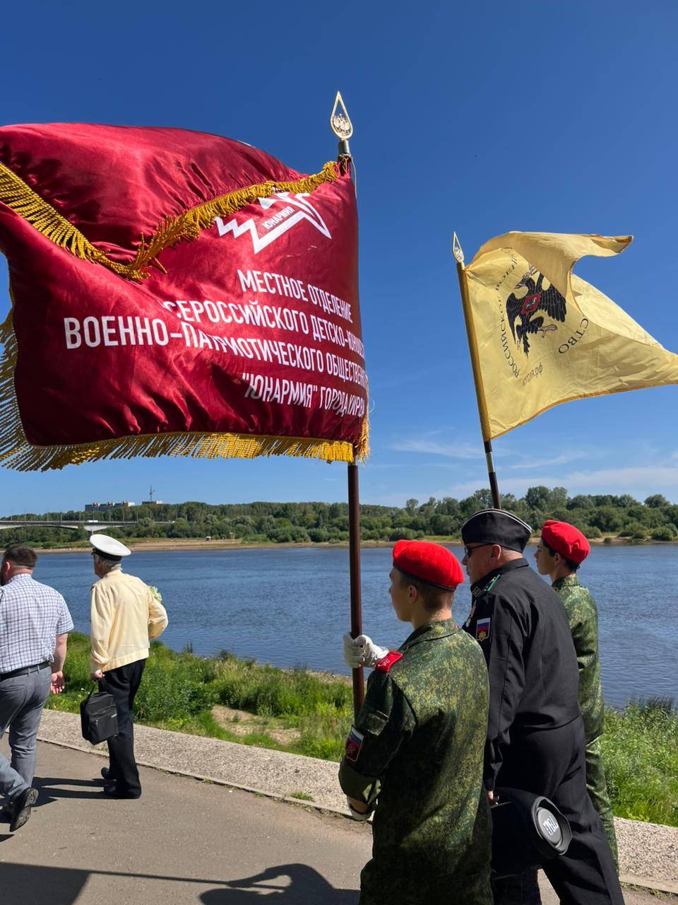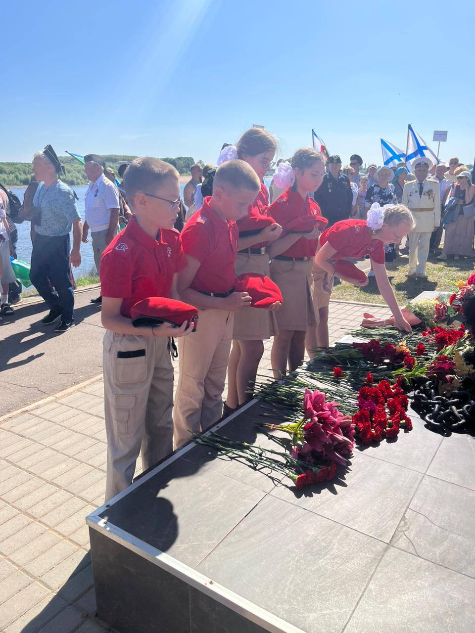 У памятника военным морякам «Якорь» на нижней набережной реки Вятки 27 июля собрались руководители области и города, члены Совета РВИО, кировчане, служившие в разное время на всех флотах нашей страны, члены их семей, педагоги ДЮЦ им. А. Невского и юнармейцы – воспитанники Центра. Юные патриоты, чтя вековые традиции и светлую память защитников Отечества, с нескрываемой гордостью и трепетом держали в руках флаги России, ВМФ, РВИО, Юнармии города Кирова и овеянный немеркнущей славой Андреевский стяг.