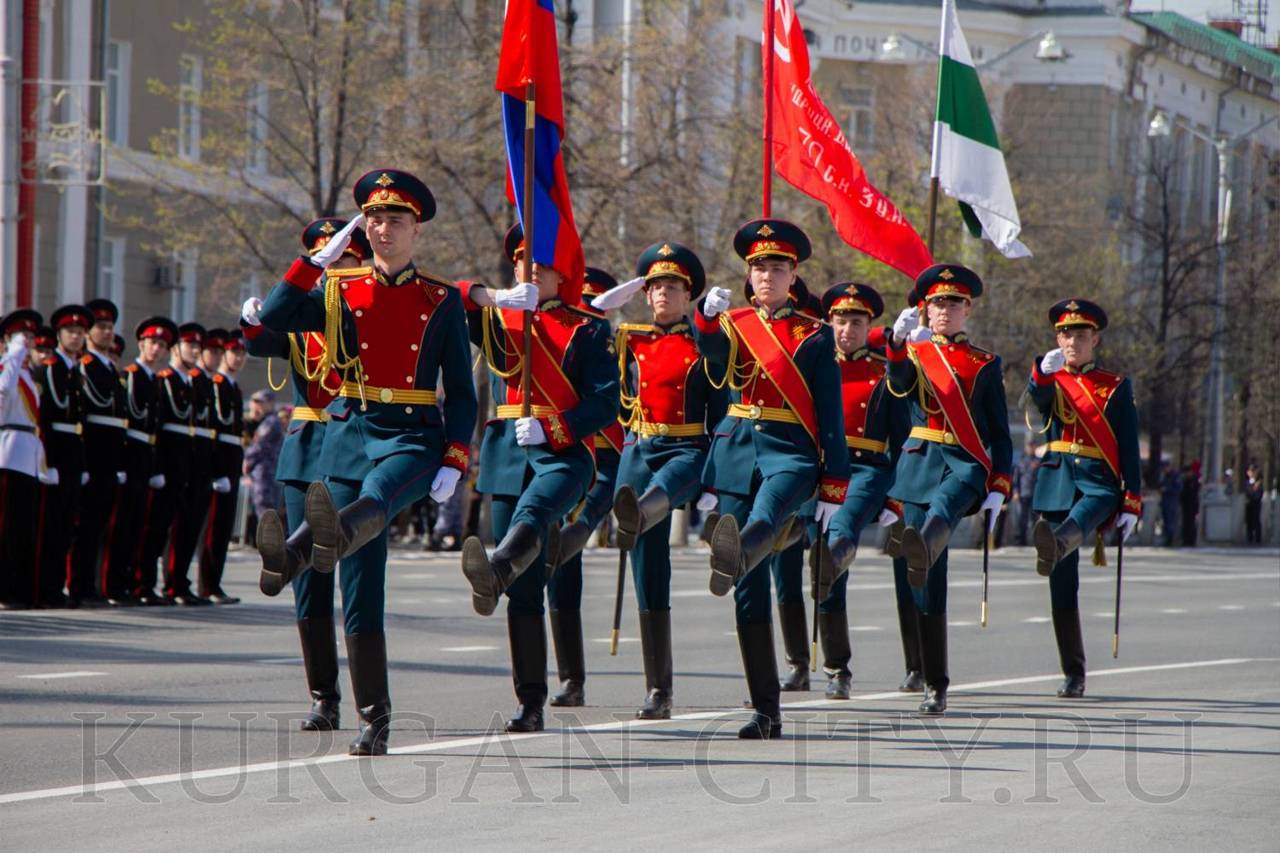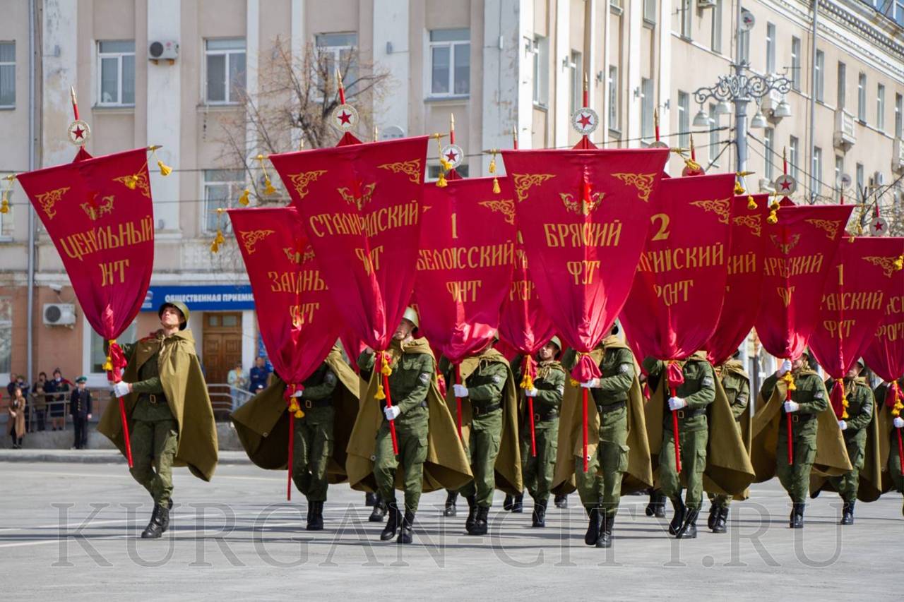 Открыл парад взвод барабанщиков курганской городской школы №23, гордо носящей имя 32-го запасного лыжного полка. Вслед за ними по площади проследовали знаменные группы с государственным флагом РФ, копией Знамени Победы, Флагом Курганской области и штандартами фронтов. Это символы патриотизма сегодняшних поколений, свидетельства доблести, мужества и героизма наших предков. Знамя Победы – штурмовой флаг 150-й Ордена Кутузова II степени Идрицкой стрелковой дивизии 79-го стрелкового корпуса 3-й ударной армии 1-го Белорусского фронта является государственной реликвией России и официальным символом победы советского народа и его Вооруженных Сил над фашистской Германией в Великой Отечественной войне.