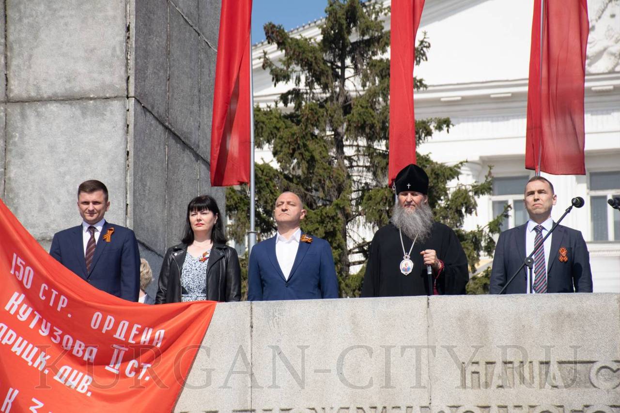 Торжественная часть началась с прохода знаменной группы. Под музыку Георгия Александрова к песне «Священная война» на главную площадь Кургана были внесены государственный флаг Российской Федерации, копия Знамени Победы и флаг Курганской области.