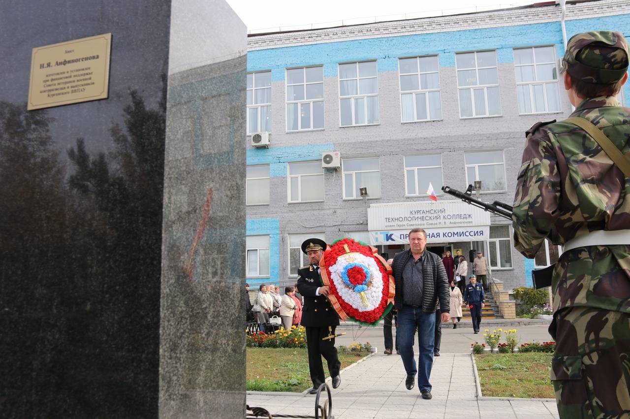 Торжественный митинг в честь дня рождения Героя Советского Союза Николая Анфиногенова состоялся в Курганском технологическом колледже, который носит его имя. У бюста Герою собрались представители администрации, студенты, преподаватели, а также приглашенные гости колледжа.